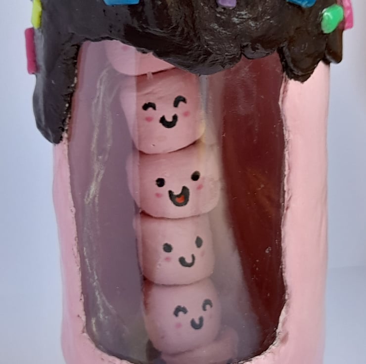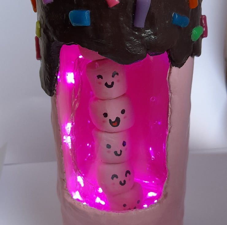 This is a handmade pink marshmallow lamp crafted with clay. Inside are a tower of friendly marshmallows each with smiling faces, with pink fairy lights behind to illuminate them at night.