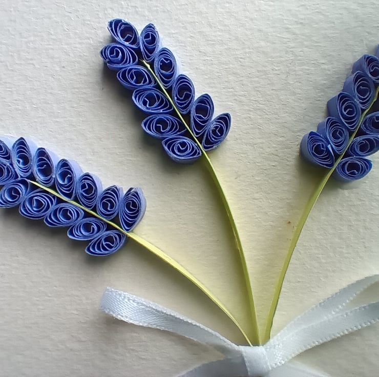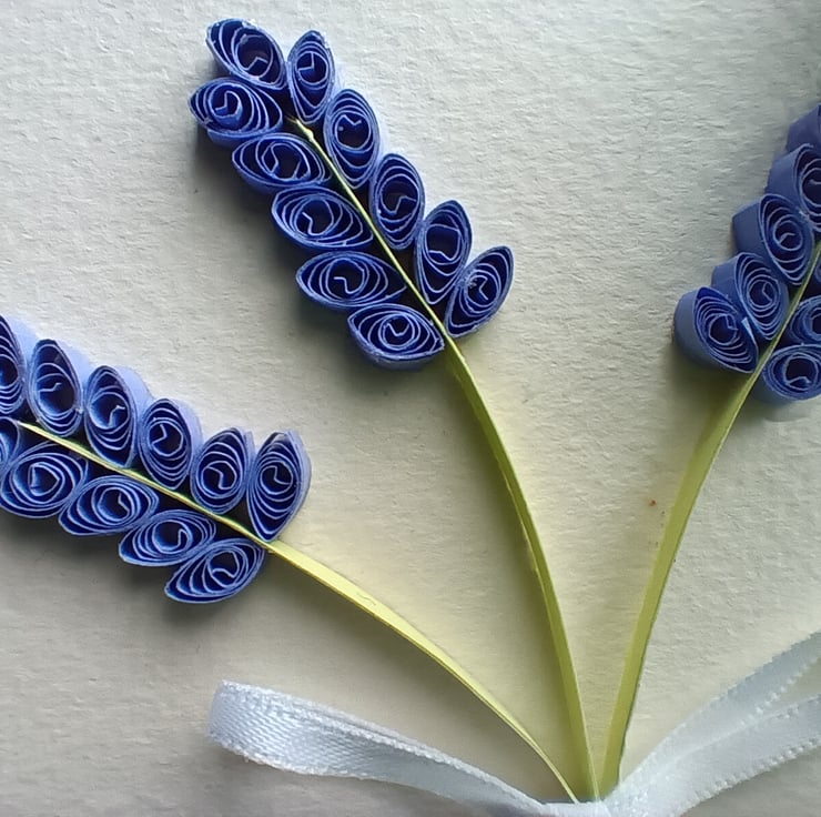 The card is made using strips of quilling paper, a brown kraft card, ream paper, polka dot blue paper, glue and ink from a printer to print the greeting. It is finished with some thin white ribbon.