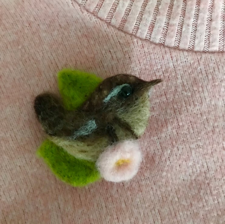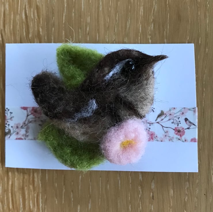 Wool felted wren , sitting amongst green leaves and a pink blossom flower .