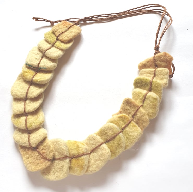 It comprises pieces of handmade merino wool and silk felt pieces which are threaded on cord, and with a double knot, it is adjustable.