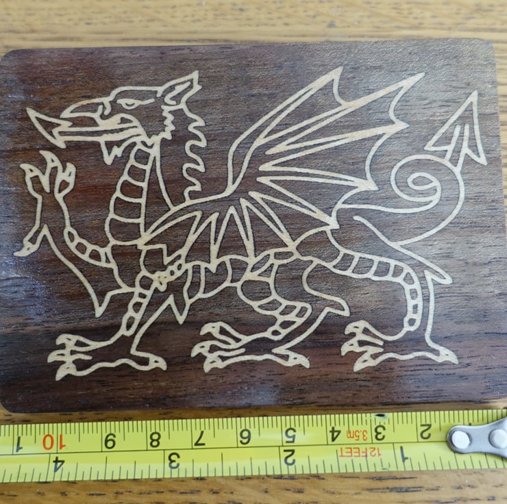 A bit late for St Davids day.. A Welsh dragon - Y Ddraig Goch wood inlay. The background is beautifully coloured walnut, inlayed with pale holly.