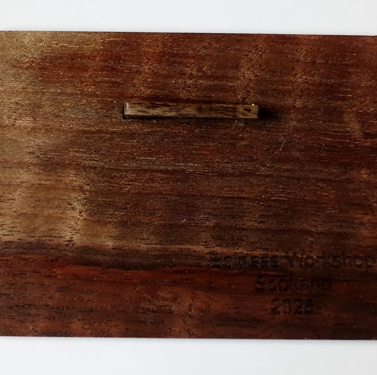 115 x 80 x 3 mm solid walnut (not plywood). A natural finishing oil has been applied (about 5 coats) to give a satin finish.