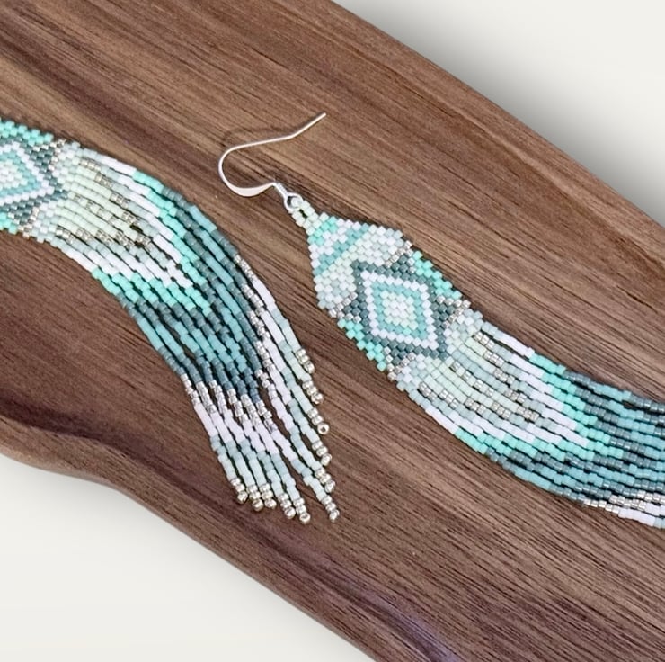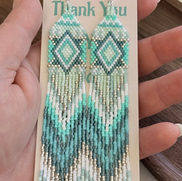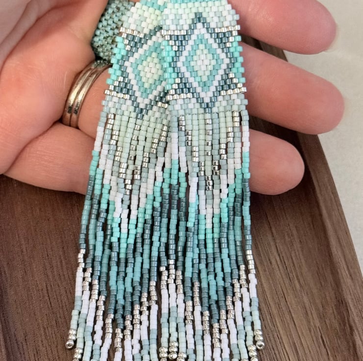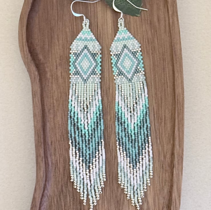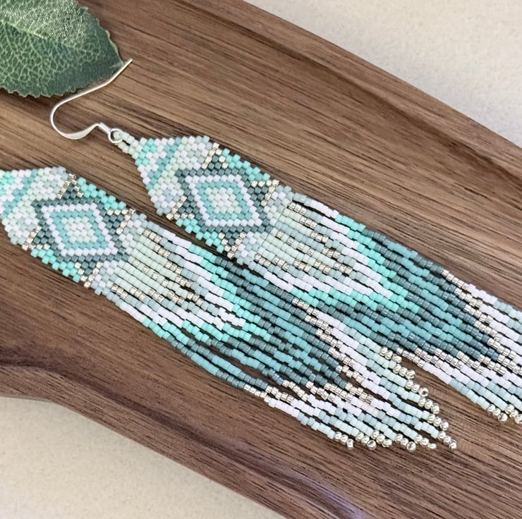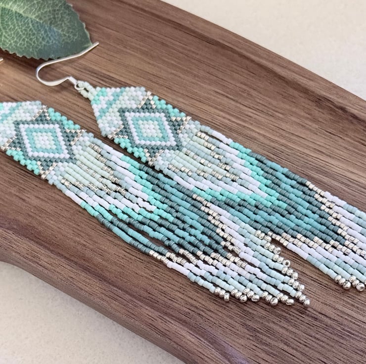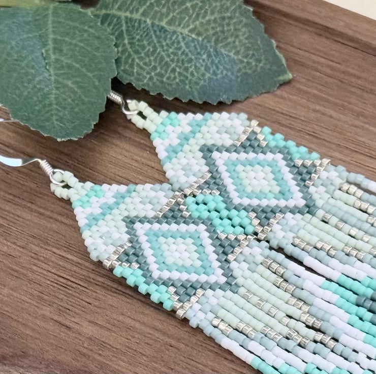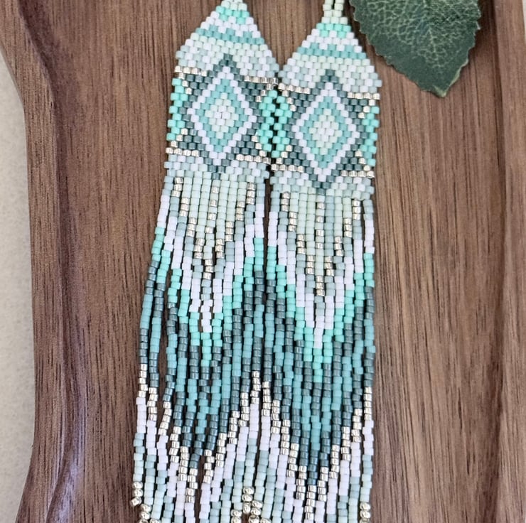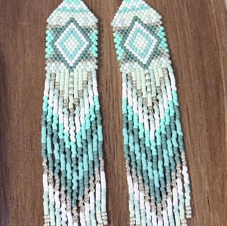 The top of the earrings has been hand woven in a straight brick stitch going up to a more traditional brick stitch triangle weave. The colours are all different shades of turquoise blue green, ranging from light to darker tones. These are mixed with subtle white and silver colours. The pattern is a diamond inside a diamond in several different colours.
