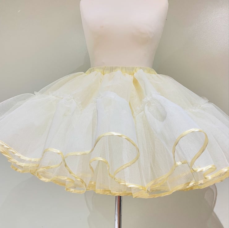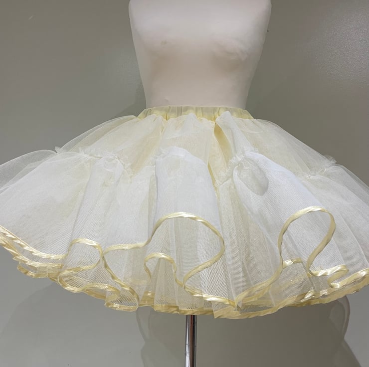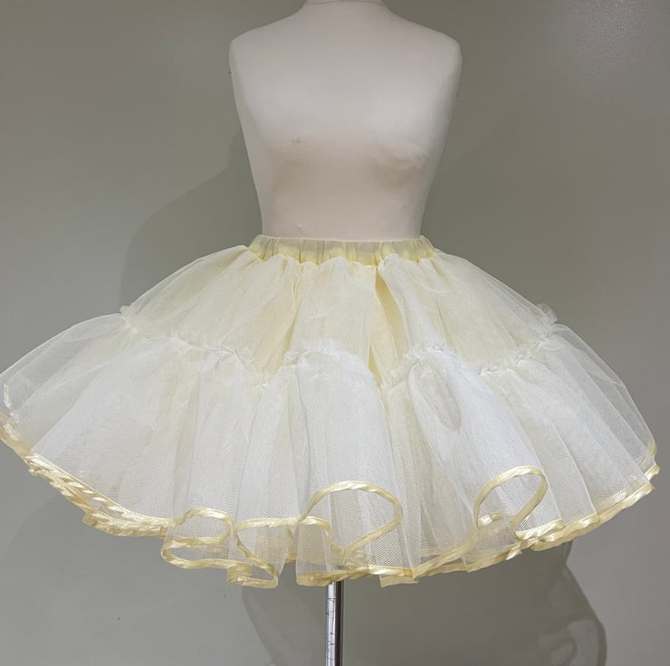 Handmade, made to order, ivory in colour dress net vintage style,circle skirt style.Available in UK clothing size. Small 10-12, medium 12-14, large 16-18, and X-Large size 20-22.The length is above- the-knee. The waistband has an elastic inside. washable with matching delicate colours. The length is (16”) with 3 layers of dress net,each consisting of 2 tiers,and a soft polyester underskirt. Edged in a delicate ivory bias trim