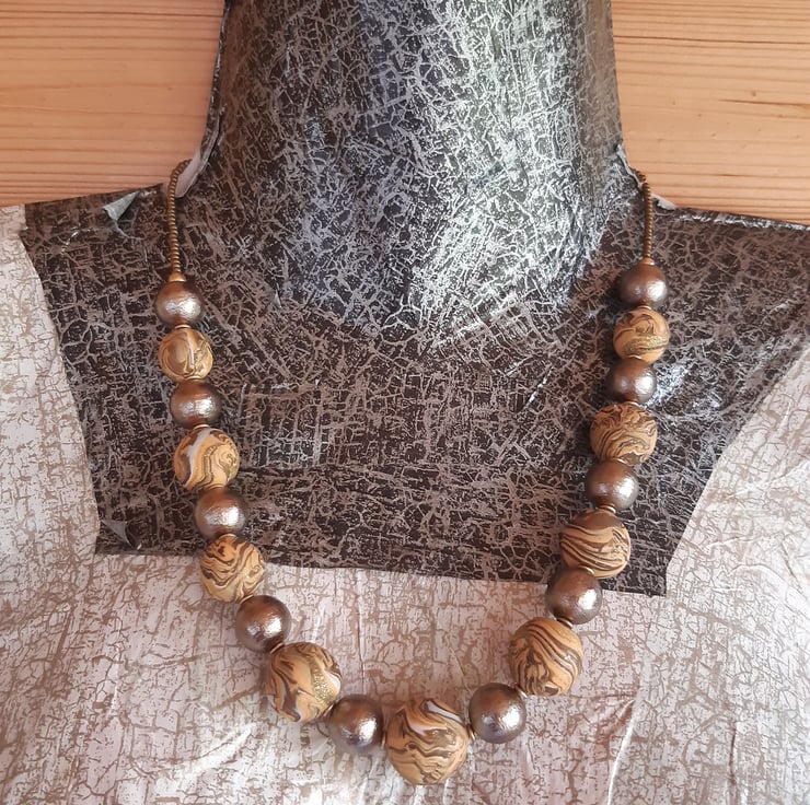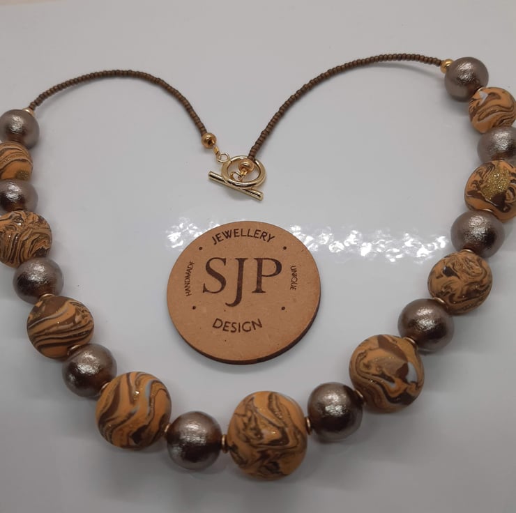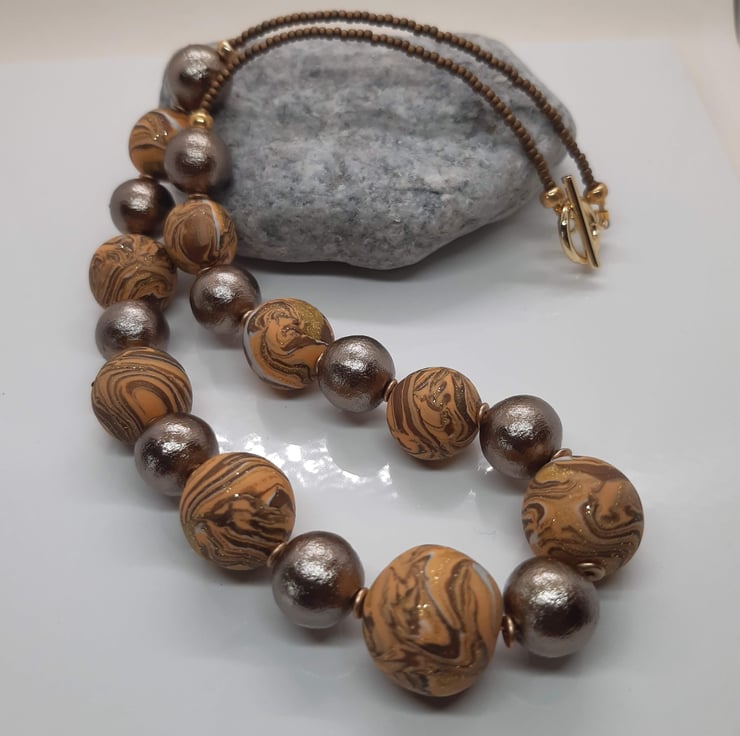 The handmade clay beads measure between 13mm and 17.2mm with 12mm bronze Miyuki cotton pearl rounds, tiny ‘O’ ring spacers and tiny brown matt seed beads to complete the look.
