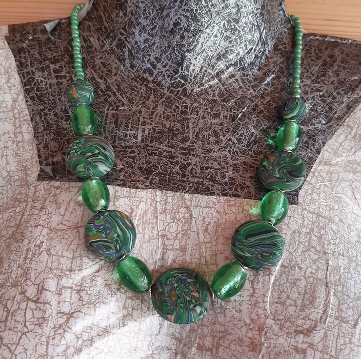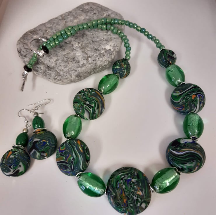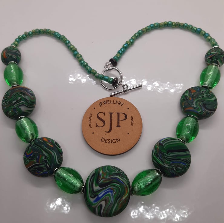 The handmade disc beads measure approx 23.5mm to 28mm with 18mm green glass oval beads in between and small wavy silver plated spacers. Large shiny green chameleon seed beads complete the look.