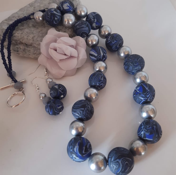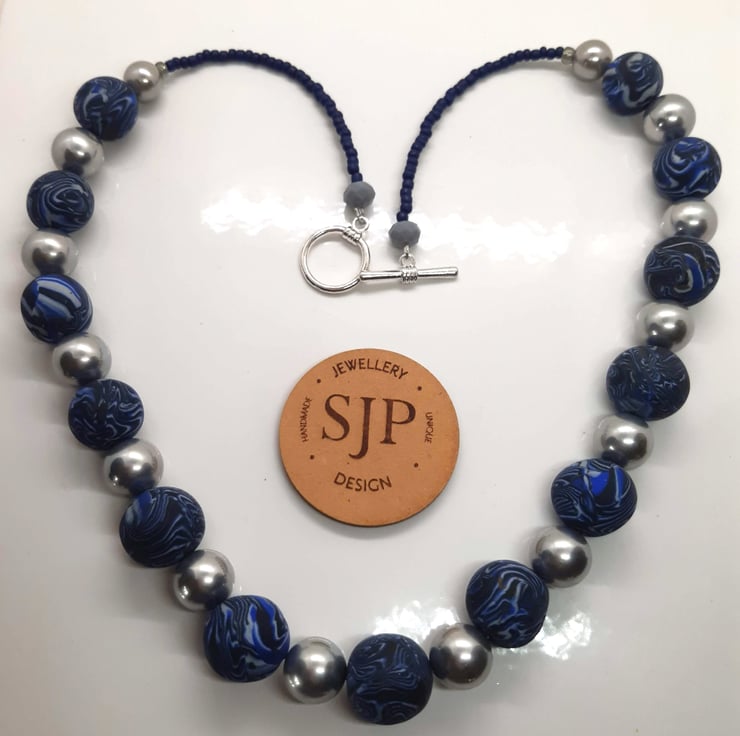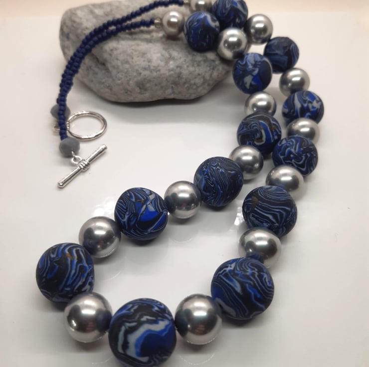 An elegant necklace featuring royal blue, black and grey polymer clay in a unique swirl design