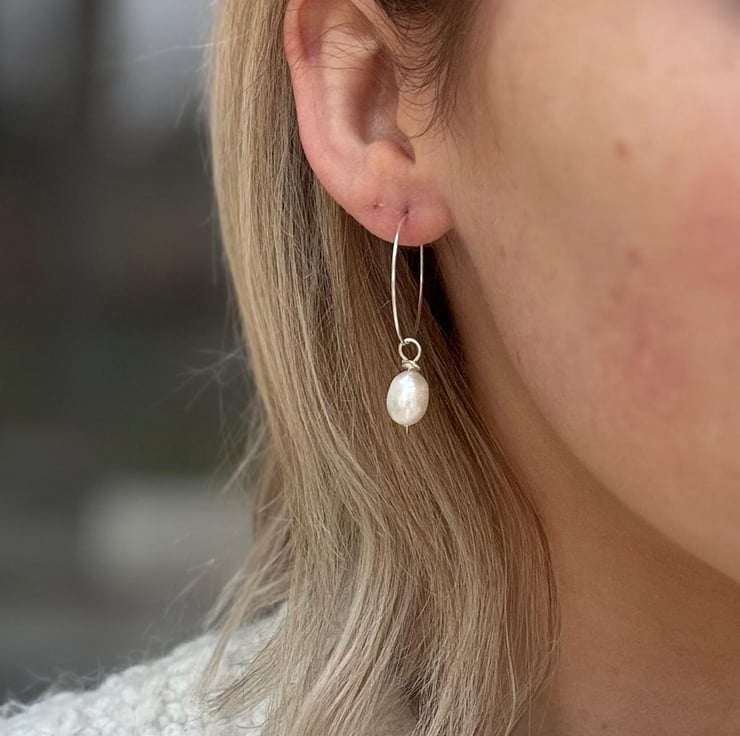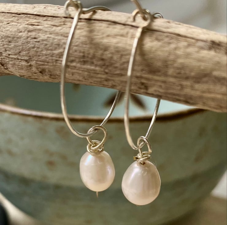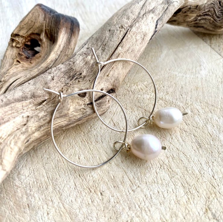 These beautiful classic sterling silver hoop earrings with freshwater pearl drops