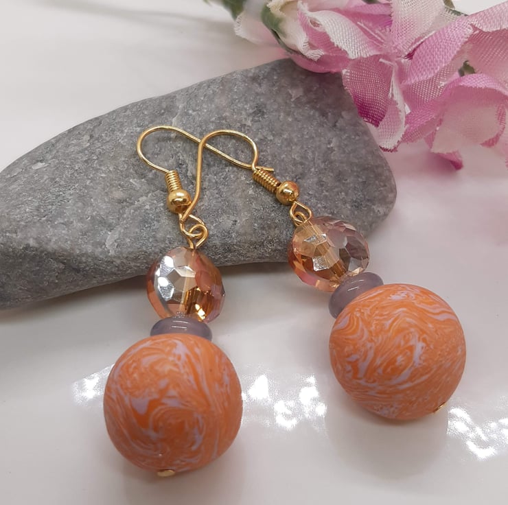 Pretty dangly earrings featuring orange, cream and lilac polymer clay in a unique swirl design