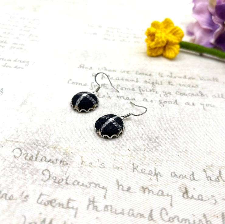 Hand-crafted with authentic St. Piran flag cotton fabric, these 15mm fabric-covered buttons are set in elegant stainless steel scallop-edged settings with scroll-detailed hooks.