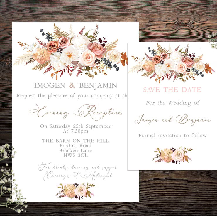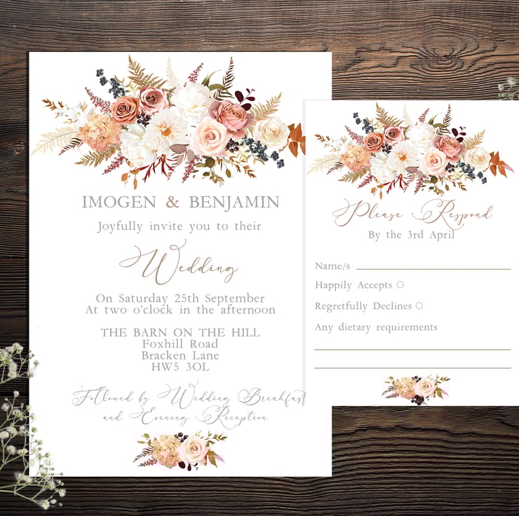 These autumnal themed invites are perfect for any autumn wedding or simply to match your beautiful chosen colour scheme.