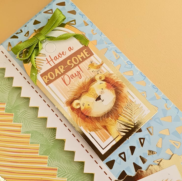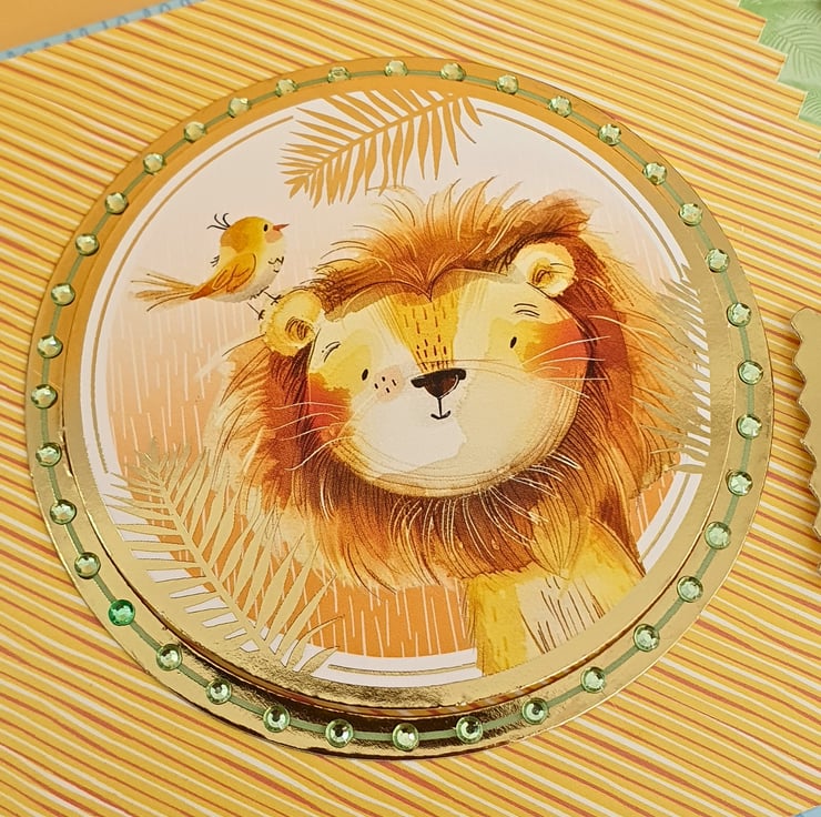 The white card base is layered with luxury blue patterned paper, along with 3 different panels of colourful cardstock, printed with different patterns. One panel with yellow - orange diagonal stripes, one with pastel green fern branches & a blue one with gold foiled triangle shapes. The two sentiments are on the right side of the card, while the main topper of a lion with a bird on its head is on the left. The card is embellished with small green gemstones and a green bow. Finished with a matching insert that has been stamped with the sentiment "It's Your Birthday" in green.