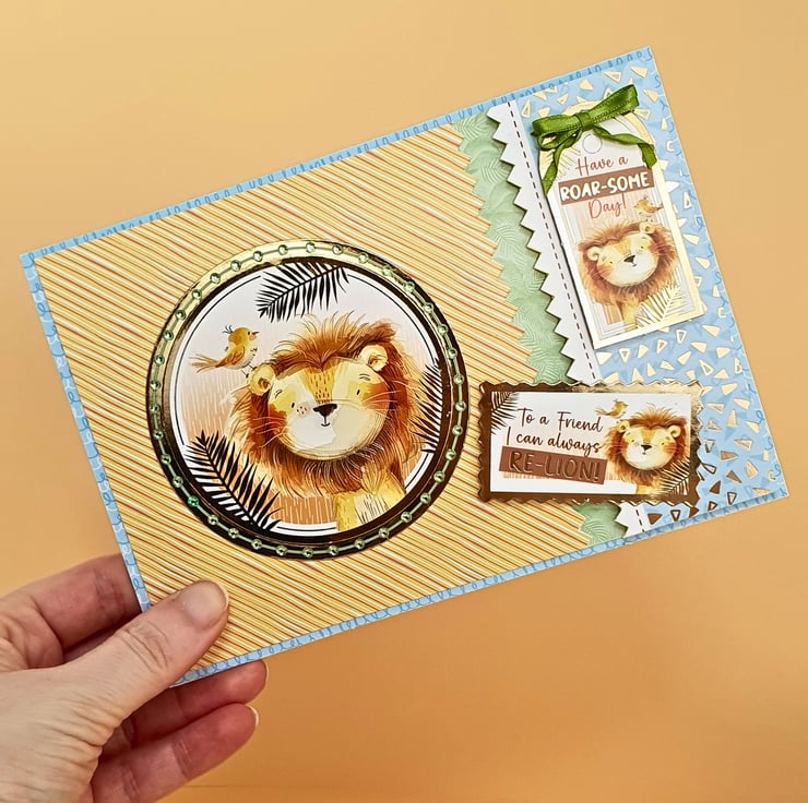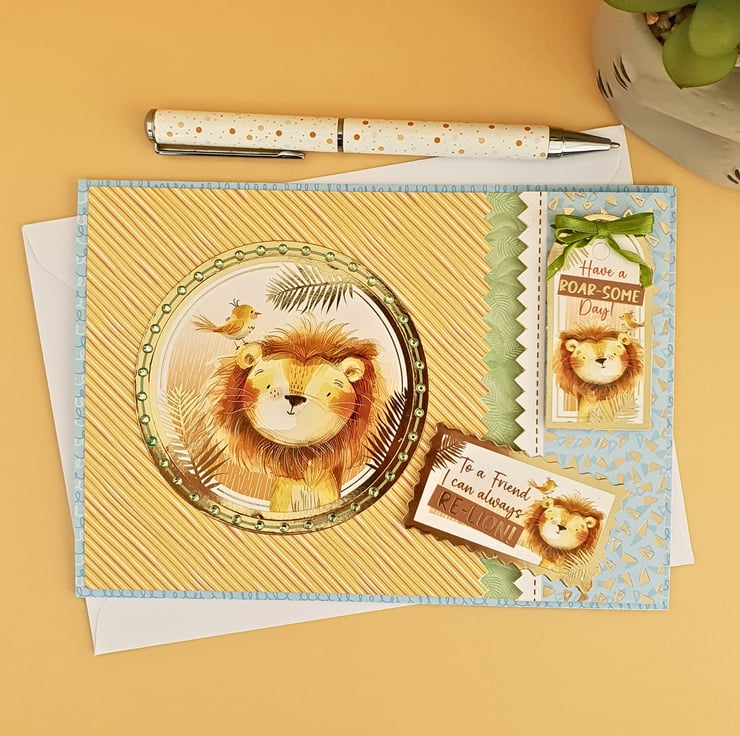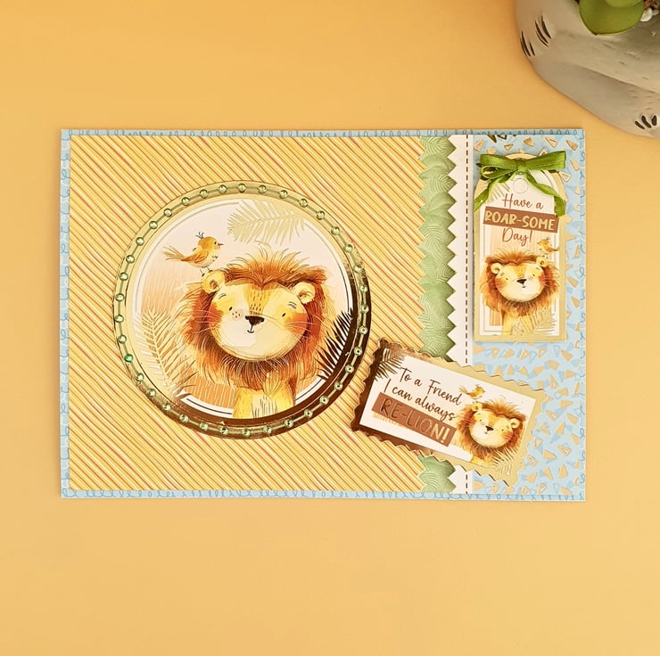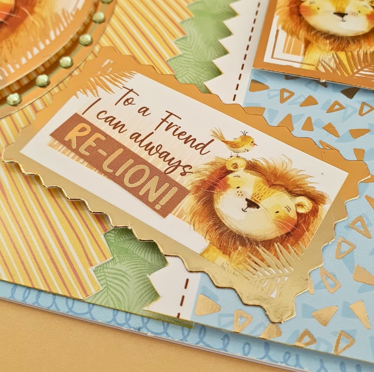 A playful lion themed birthday card perfect for a good friend who is always there for you! The sentiments "To A Friend I Can Always Re-Lion!" & "Have A Roar-some Day" will point out that their value is recognised on their very special day!