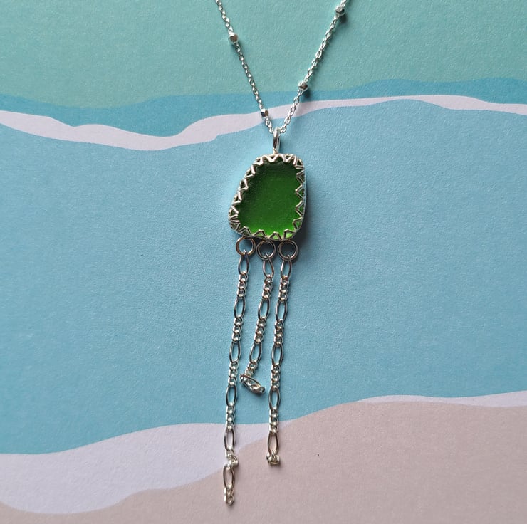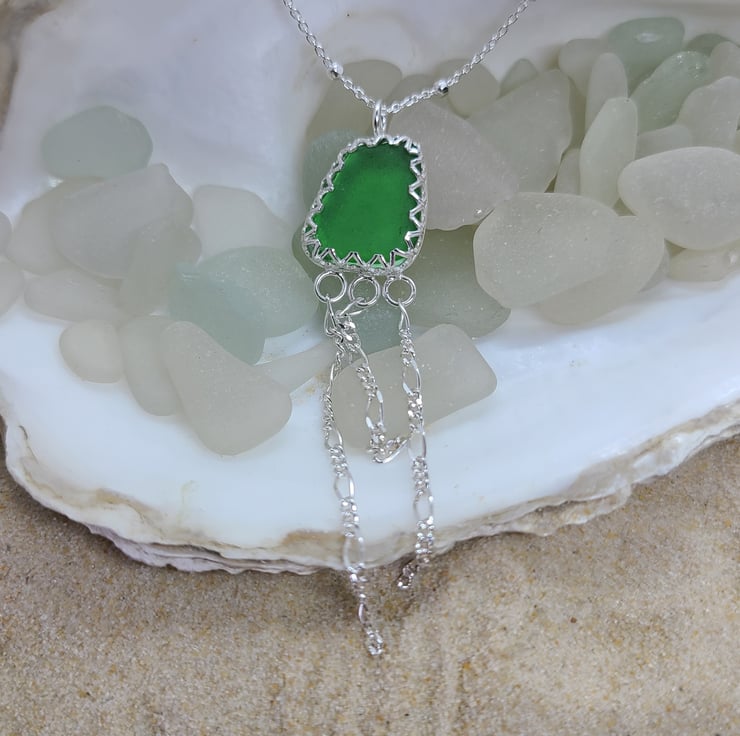 This stunning handmade pendant has a gorgeous piece of Kelly green sea glass, set in a fancy fine silver bezel and silver chain tentacles.
