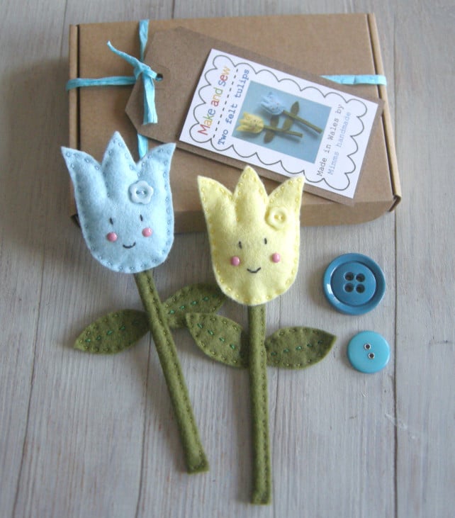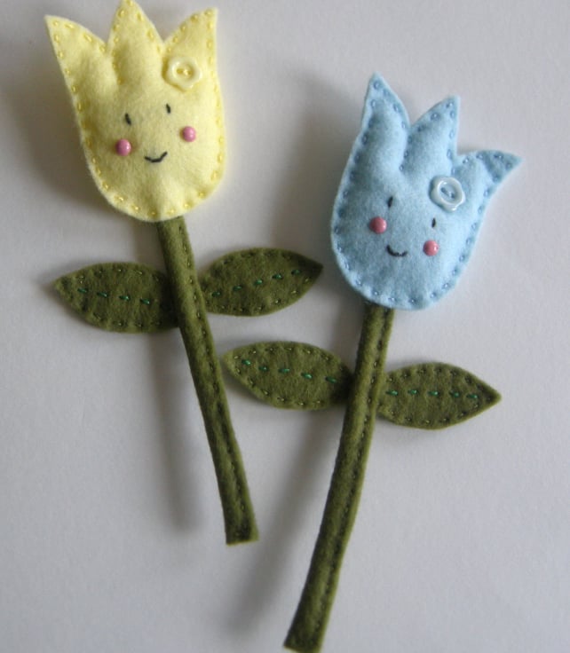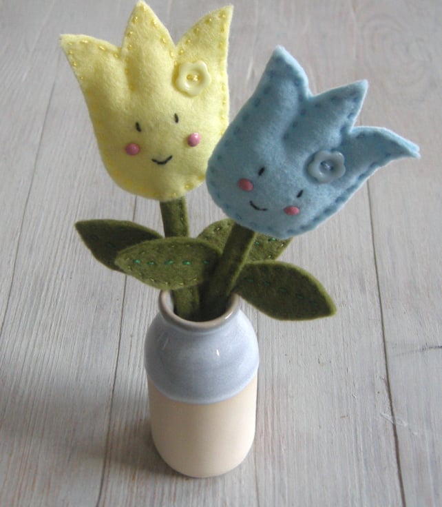 Make one blue and one yellow happy tulip felt flowers to place in vase which will bring a smile to your face. Make them for a gift for Mother's day or for a special friend or as a gift for a crafter.