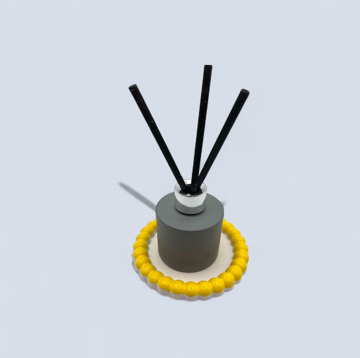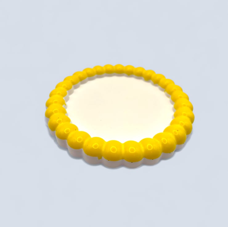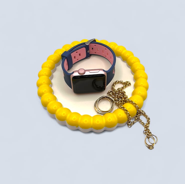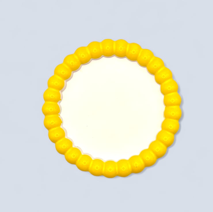 This design was inspired by the simple joy of bold colour paired with clean lines. The bright yellow raised bubble edge adds a playful, sculptural frame around the calm white centre, creating a piece that feels both modern and cheerful. It brings a pop of sunshine to everyday spaces, turning small rituals like placing your jewellery or keys down into something a little more joyful.