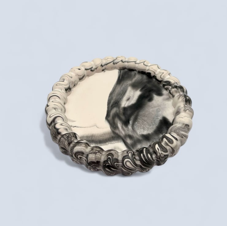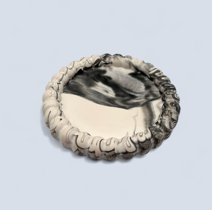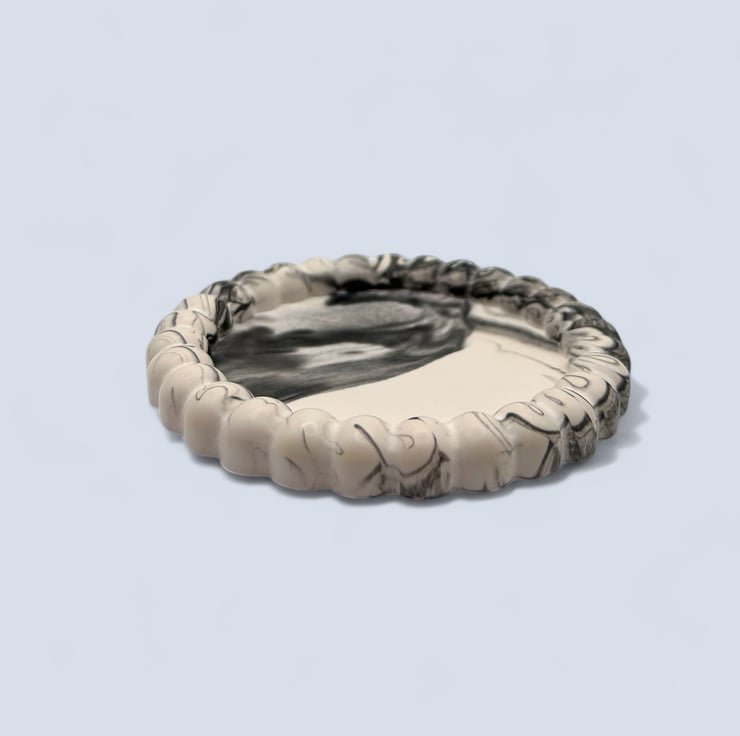 The tray is handmade from a water-based mineral material with a smooth, stone-like feel. Each piece is individually made in my home studio, and the marbling settles differently every time, meaning no two trays are the same. Subtle air bubbles or gentle colour variations are part of the handmade process and add to the character of each piece.
