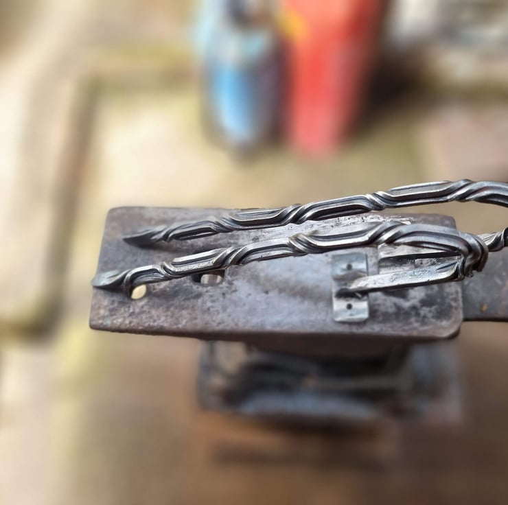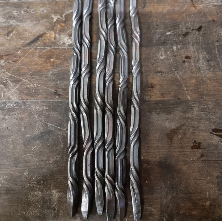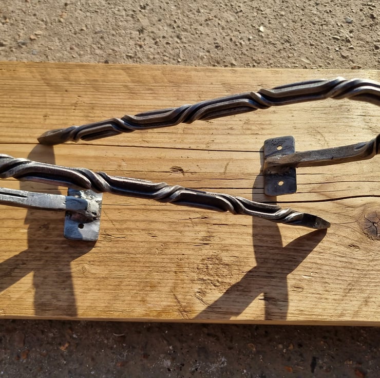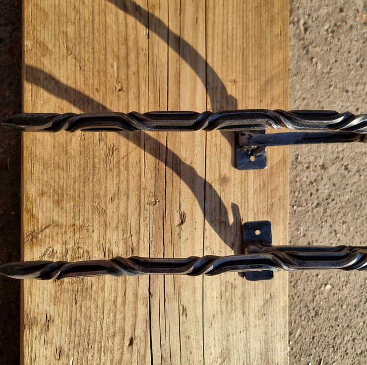 These unique reverse twist curtain tiebacks are hand forged, here in the UK. They are made by cutting a groove in each 1cm square bar on each side. Heating the bar up and twisting the bar in alternate directions to create the unique pattern.