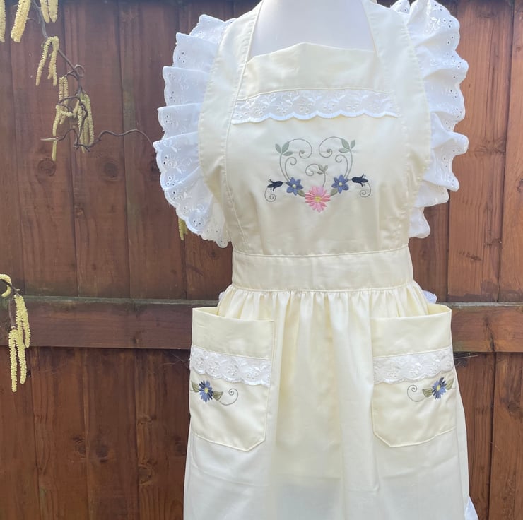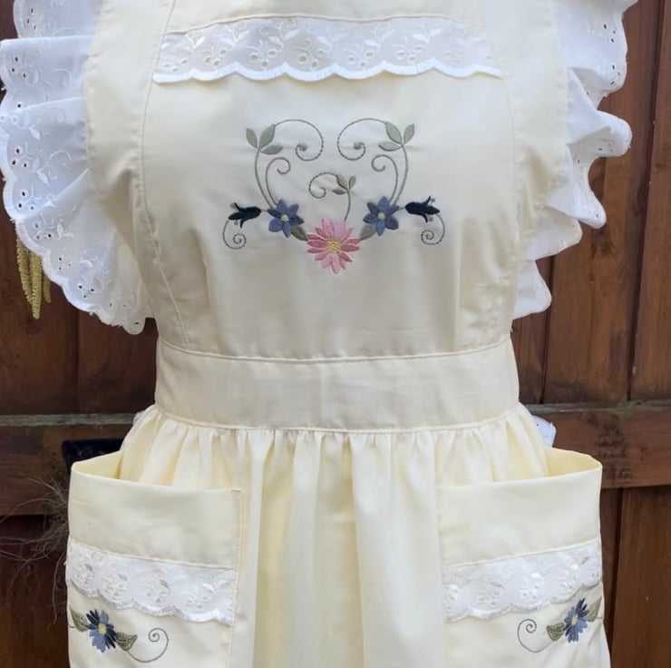 D&L Sewing introduces you to this amazing stunning and professionally done retro style, Victorian,full apron!White with embroidery lace frilly heart flowers embroidered,100% organic cotton available in most of UK clothing size,small 10-12, medium 12-14,large 16-18,Xl 20-22, and plus size if enquired. Washing machine washable with matching colours and iron safe too.Treat yourself or a loved one to brighten up the festive food preparation experience! Ideal present for your mom, wife, girlfriend