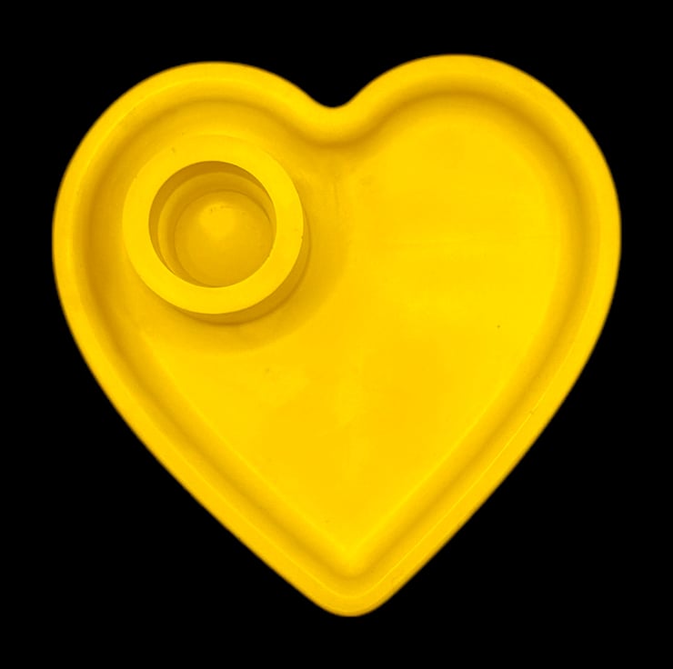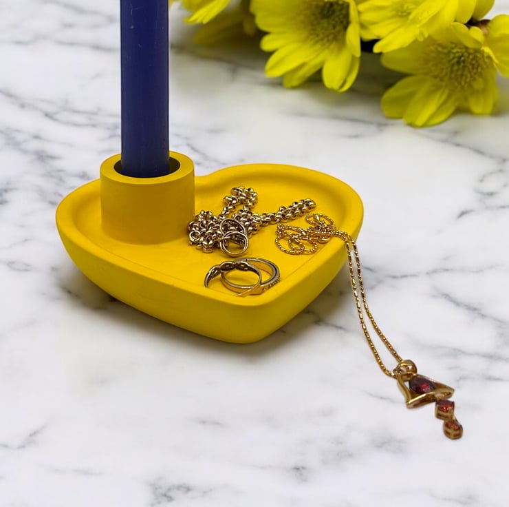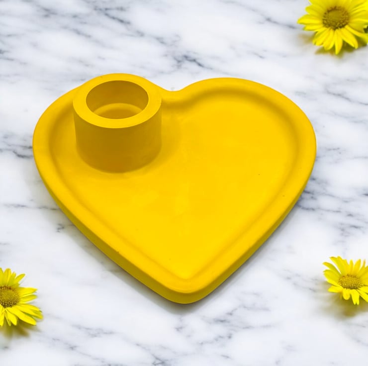 This candlestick features a raised holder situated in the top left corner of a yellow heart-shaped dish base. Not only can it hold candles, but the heart-shaped base can also be used to store and display trinkets or knickknacks. It is crafted from a premium British plaster known as Crystacast. With a dense, smooth, and luxurious finish reminiscent of marble, it has a lovely, weighty feel. The beautiful vibrant yellow colour will make a statement wherever it is placed.