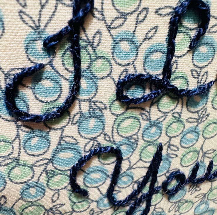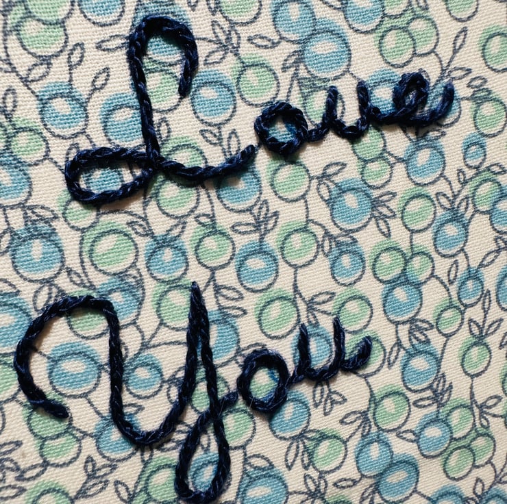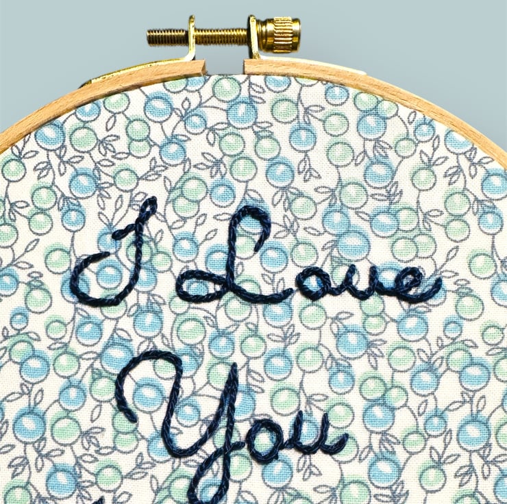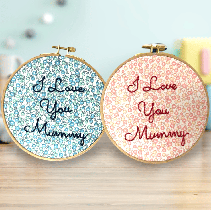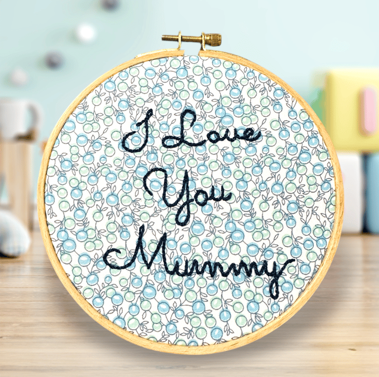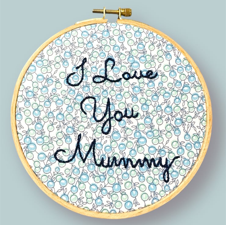 The text “I love you Mummy” is hand embroidered using a quality colour fast navy blue DMC Perle thread. This is a thicker thread, stitched so it stands proud of the fabric and has a subtle sheen.