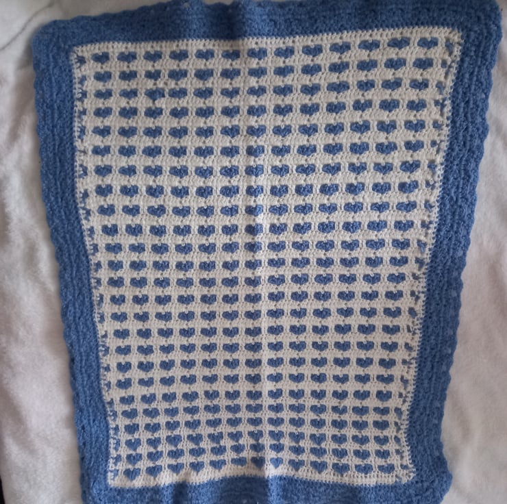 Hand made blue and white crocheted baby pram topper. Made from acryclic thread. Perfect for baby pram topper or car seat cover.