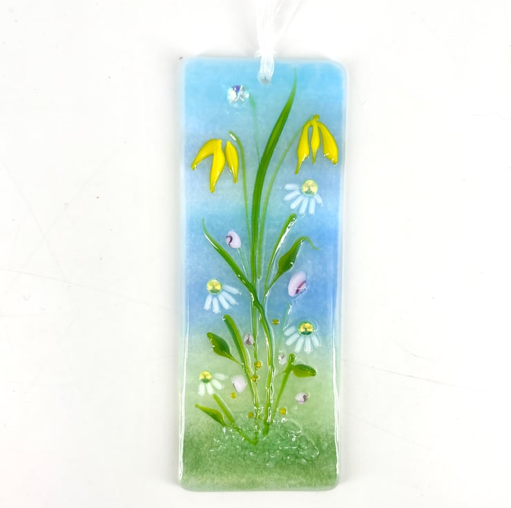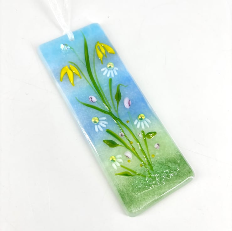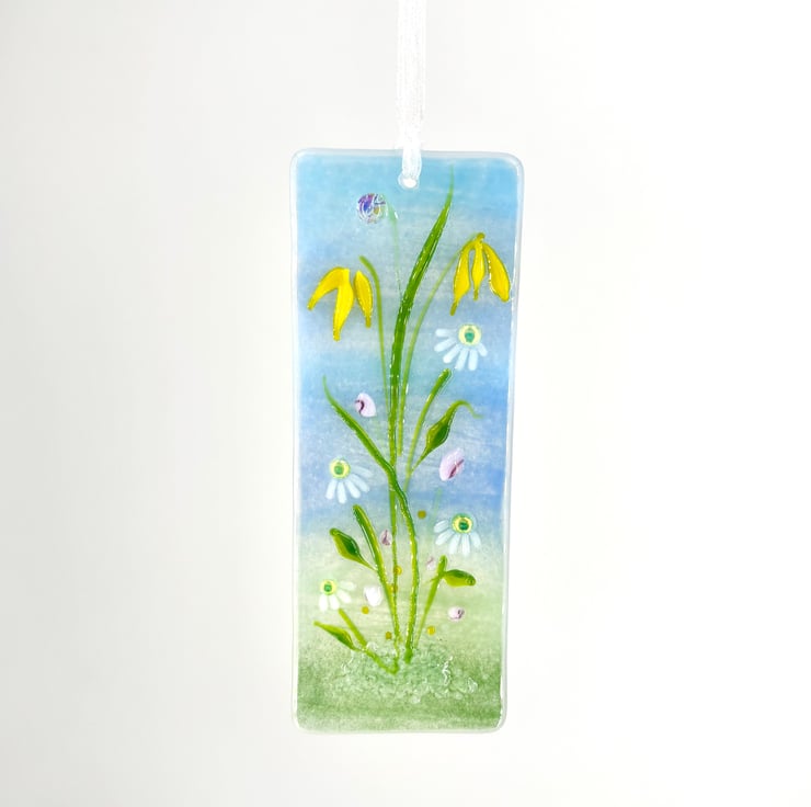 A lovely fused glass light catcher with a pretty daisies and yellow flowers.