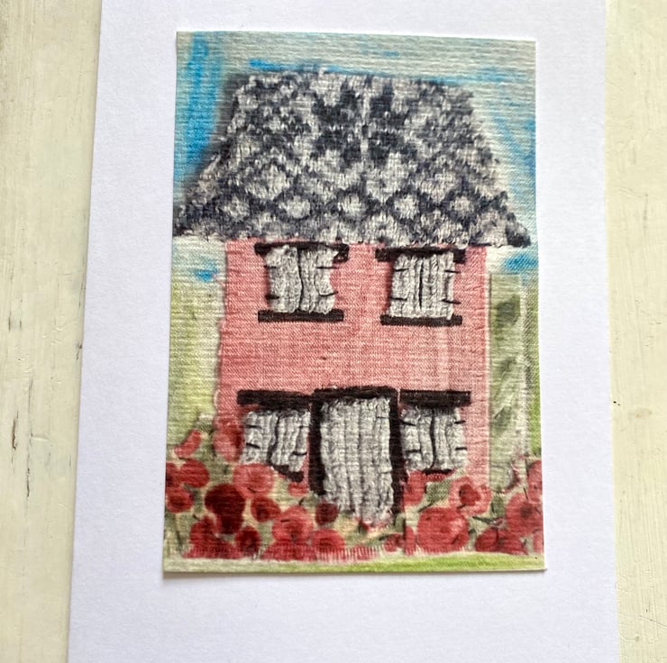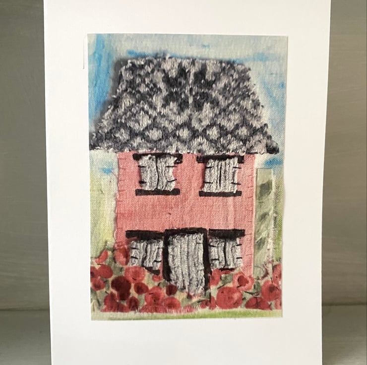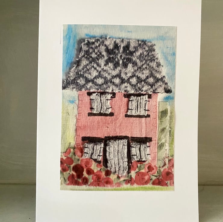 A print of one of my original textile collages depicting a pink cottage with a flower garden.