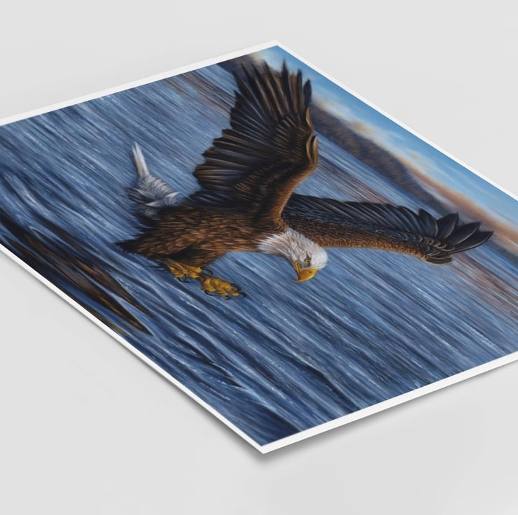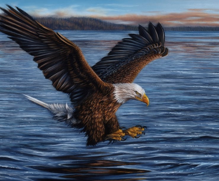 There are few more majestic sights in nature than that of the eagle. Elusive, mysterious and deadly, this apex predator is an irresistible challenge to capture on paper. This bald eagle, the national symbol of the USA, swoops towards water to catch a fish.