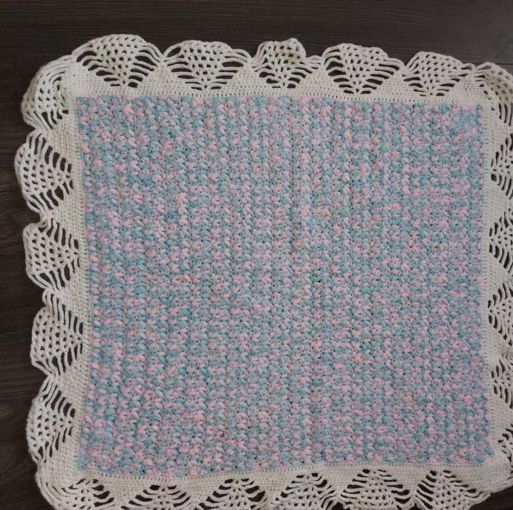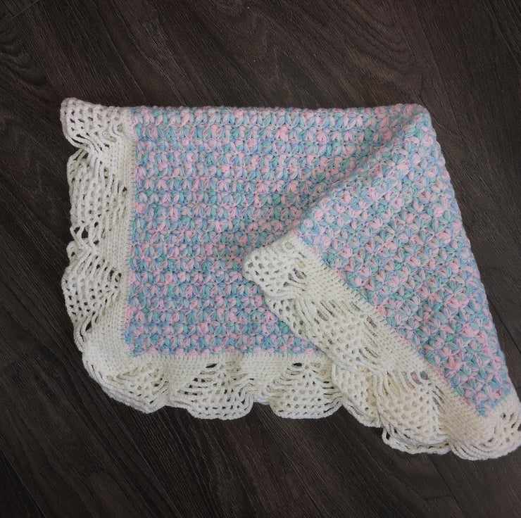 Hand multicolour baby pram or seat topper.Made from soft acrylic thread. Warm hand wash only. Make sure baby fingers do not get tangeled in the stiches.
