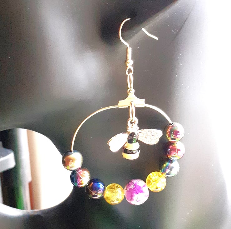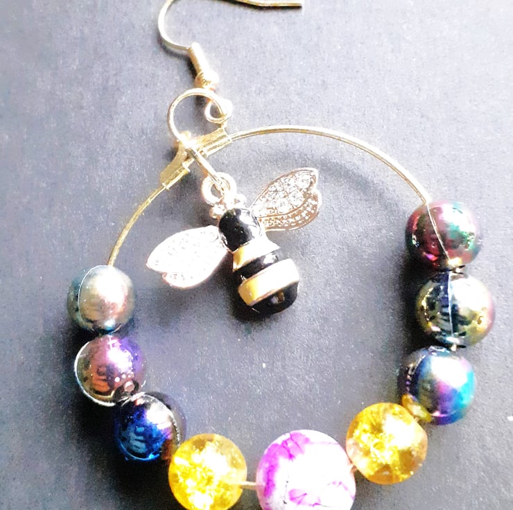 Introducing my beautiful handmade Bee Hoop Earring. A stunning mix of shimmering rainbow beads and a drawbench bead with a delicate bee charm.