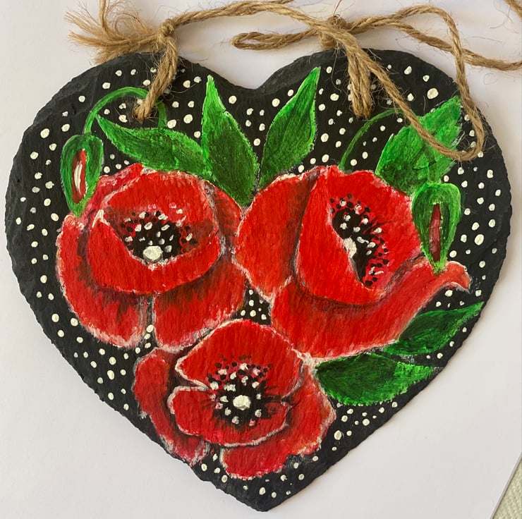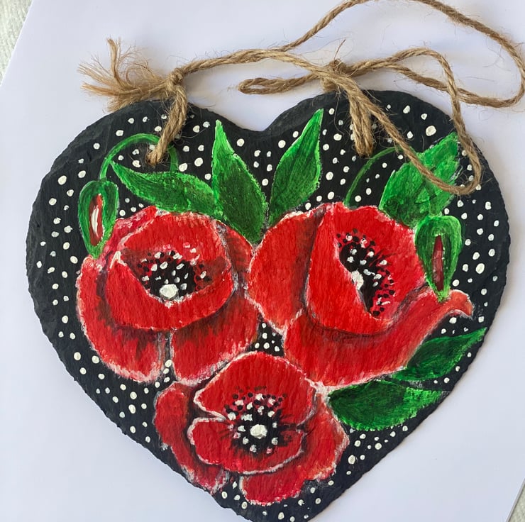 Hand painted 6 inch slate heart , decorated with red poppies and ready to hang