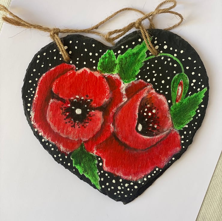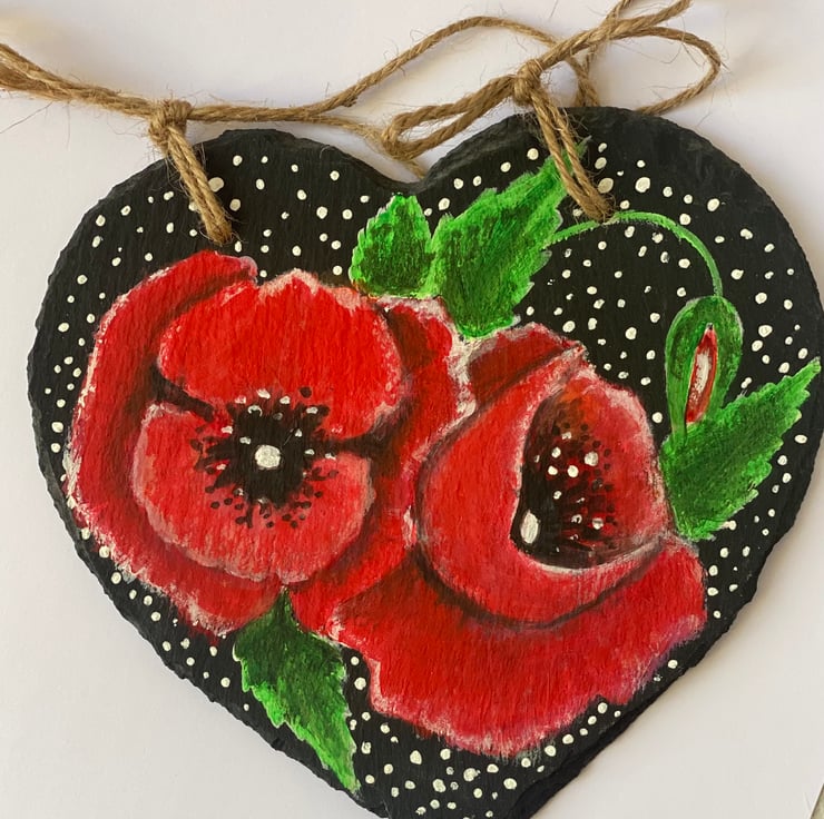 Decorated with red poppies, this 6 inch slate heart is hand painted and ready to hang