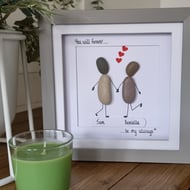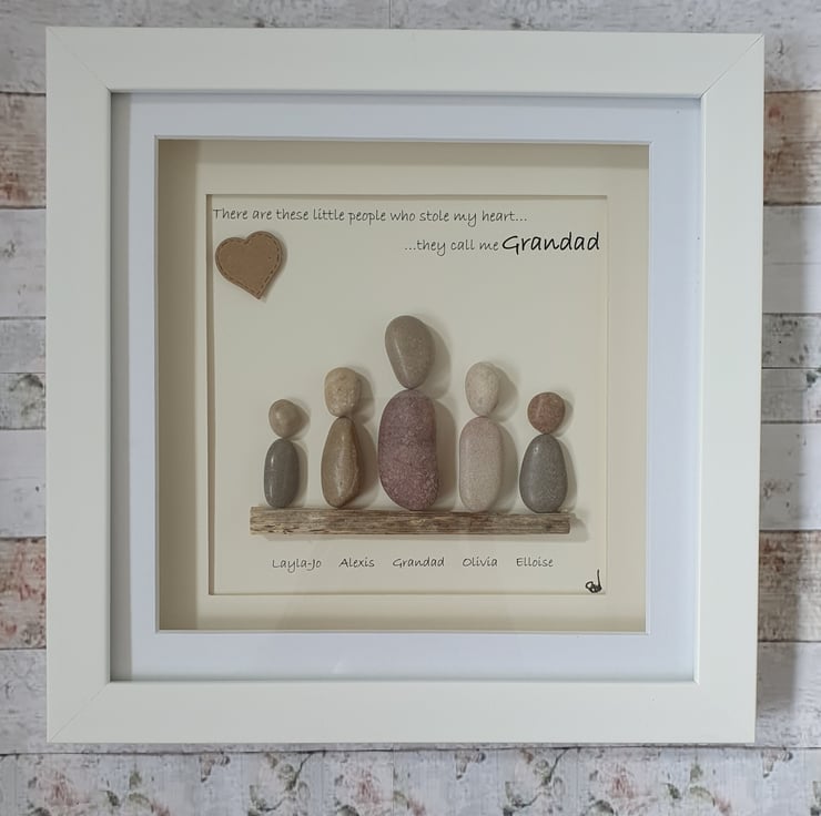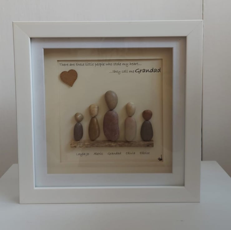 Beautiful handmade pebble art “Grandparents” picture that can be personalised to create a picture that is unique to a special person in your children's lives. You could add additional characters to the scene or maybe pets. The wording can be altered to accommodate Nanny, Nana, Grandpa, Gramps.