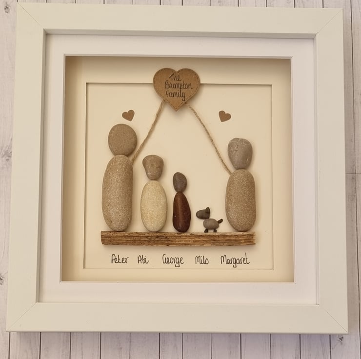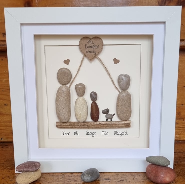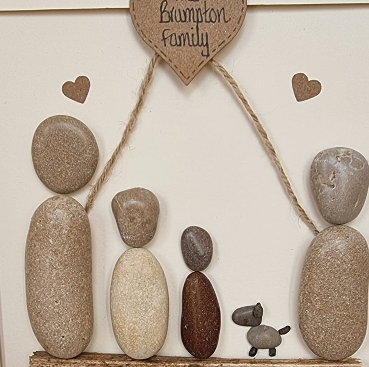 A truly unique, one of a kind, beautiful handmade pebble art “Family” picture that can be personalised to create a picture that is unique to every family. This picture can have additional people added and can include pets. The family name appears in the heart at the top of the picture and the names of individual family members are included along the bottom for the of the picture. Maybe you are a blended family or have different surnames? Not a problem the family name in the top heart can be replaced with "Our Family".