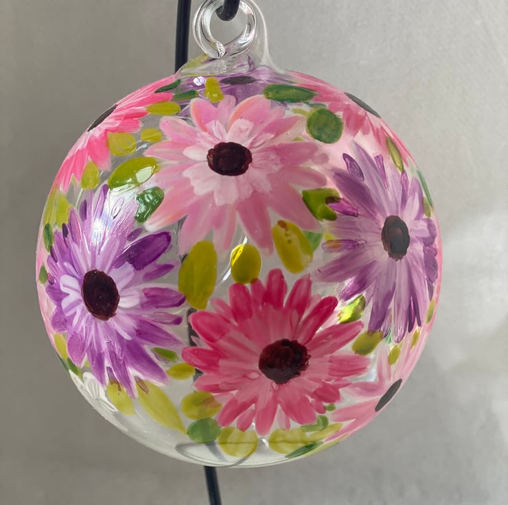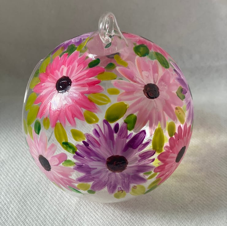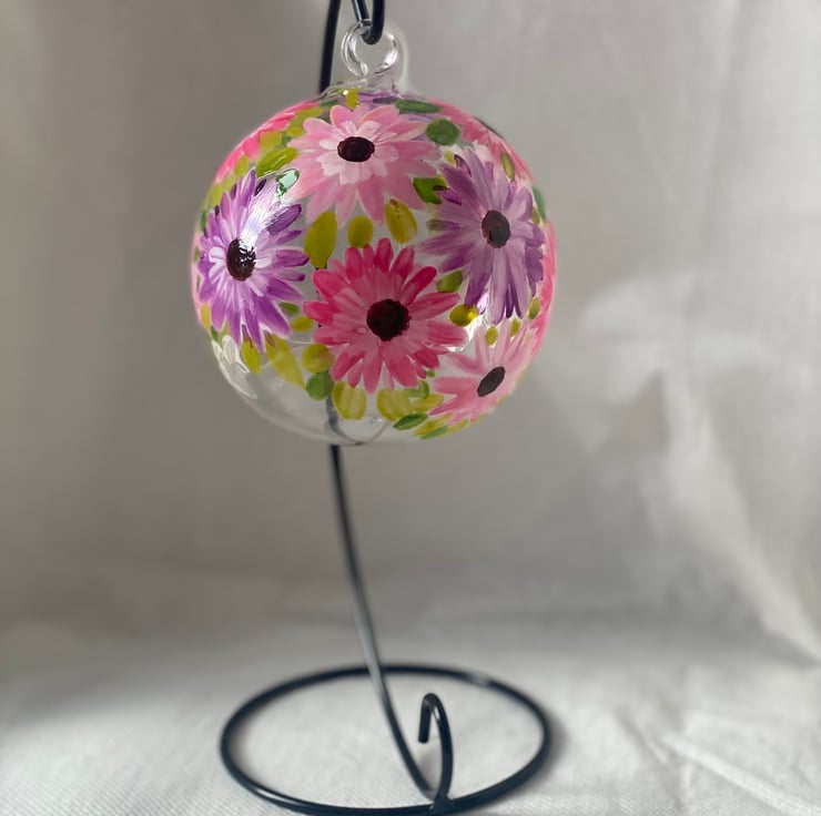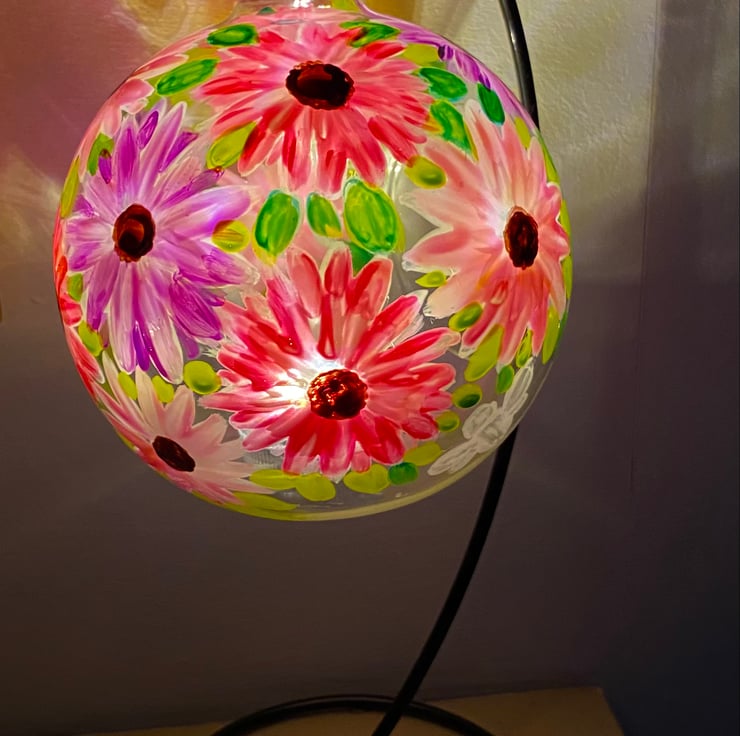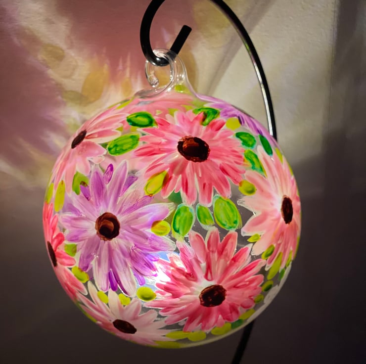 A lovely Spring floral tealight holder with pink and purple daisies.