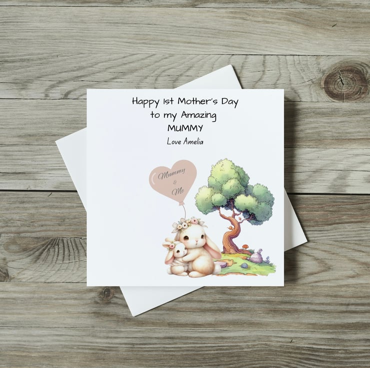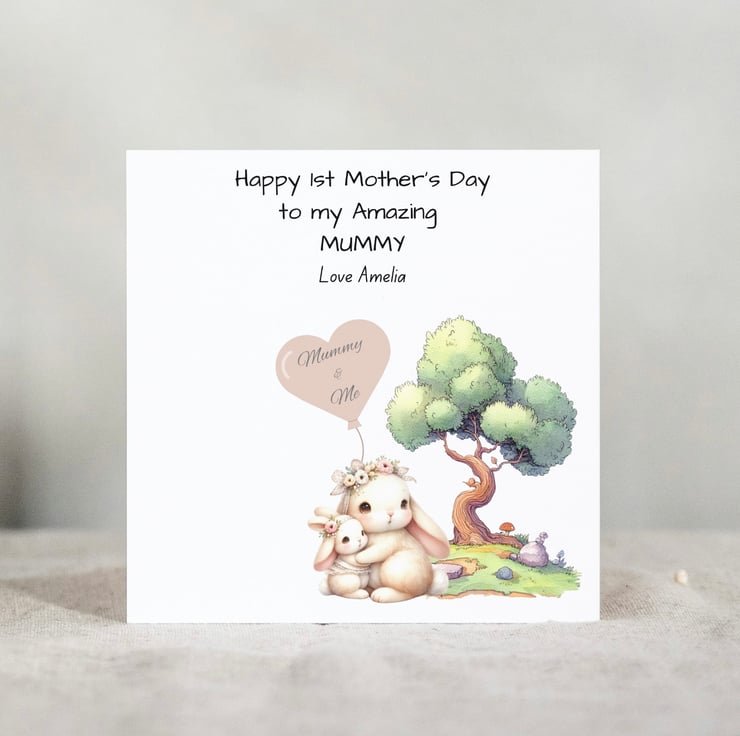A handmade 1st Mother’s Day card for a beautiful daughter featuring mother and baby rabbit, a heart ballon with mummy and me..