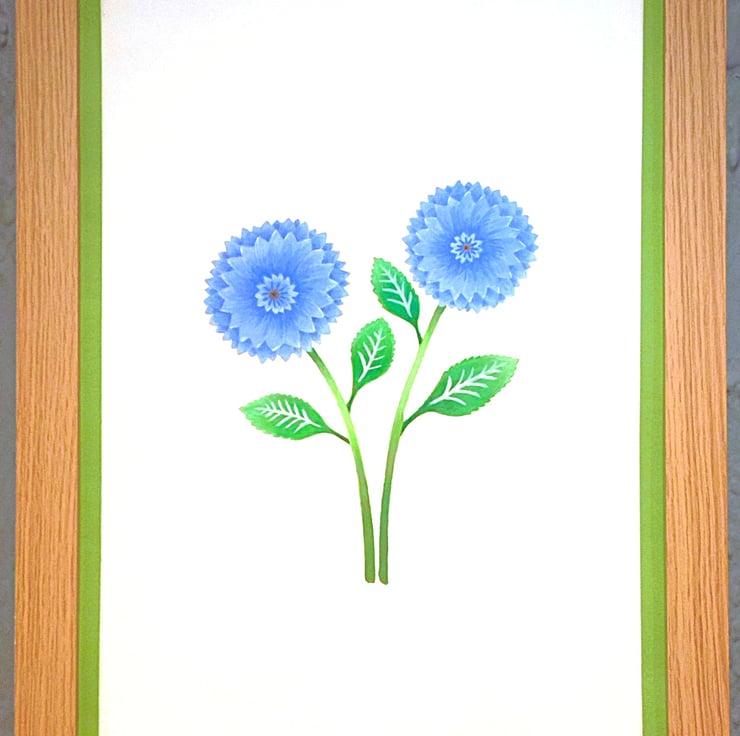 Framed high-quality coloured A3 print of my painting of blue dahlia on a white background with a hard backing. The print comes finished with a stylish light green border. Framed with an expensive Styrene Protective Perspex (which has same clarity of glass) ready to hang. Choose from three different types of frame; black, oak or dark oak(see images). Colours of print and border may differ slightly due to computer/phone settings. All purchases delivered within 7-10 working days.