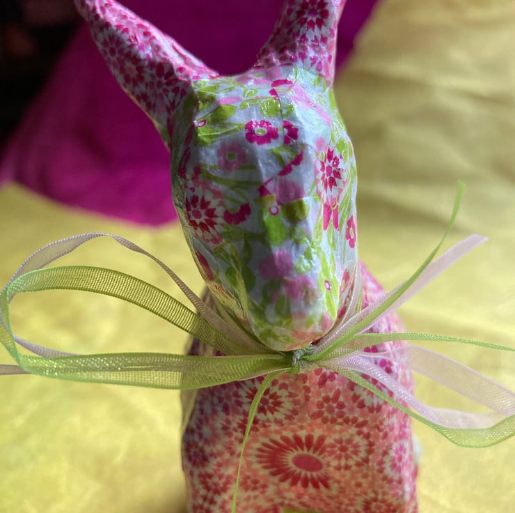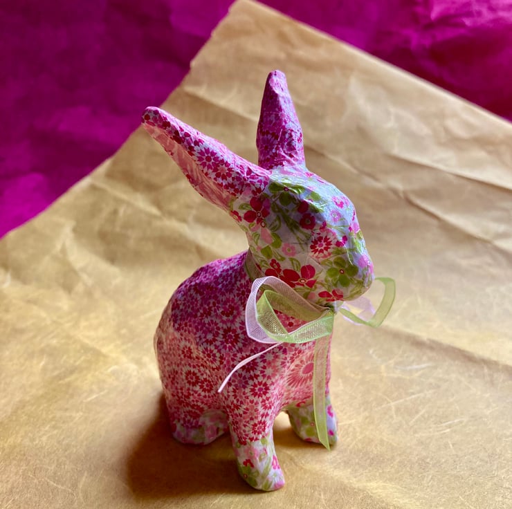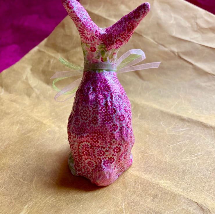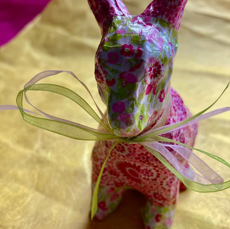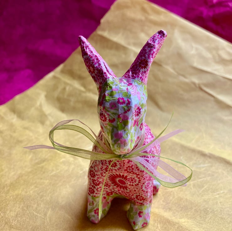 This pink and green paper mache rabbit had been decopatched in green and pink patterned papers and then varnished.