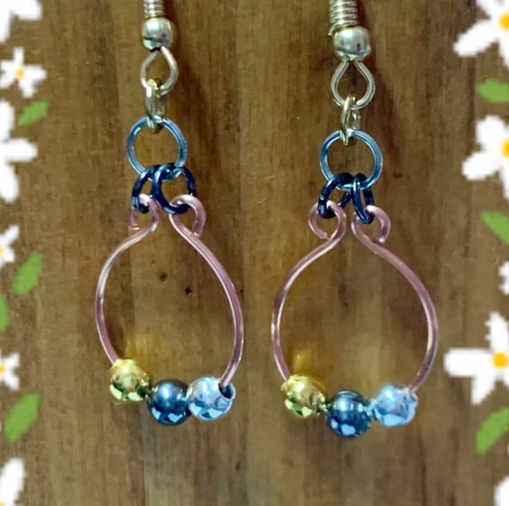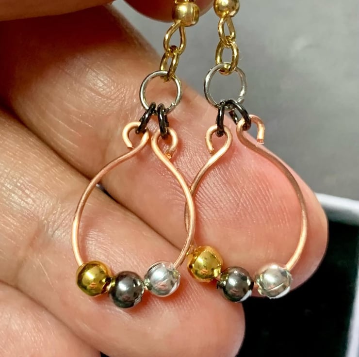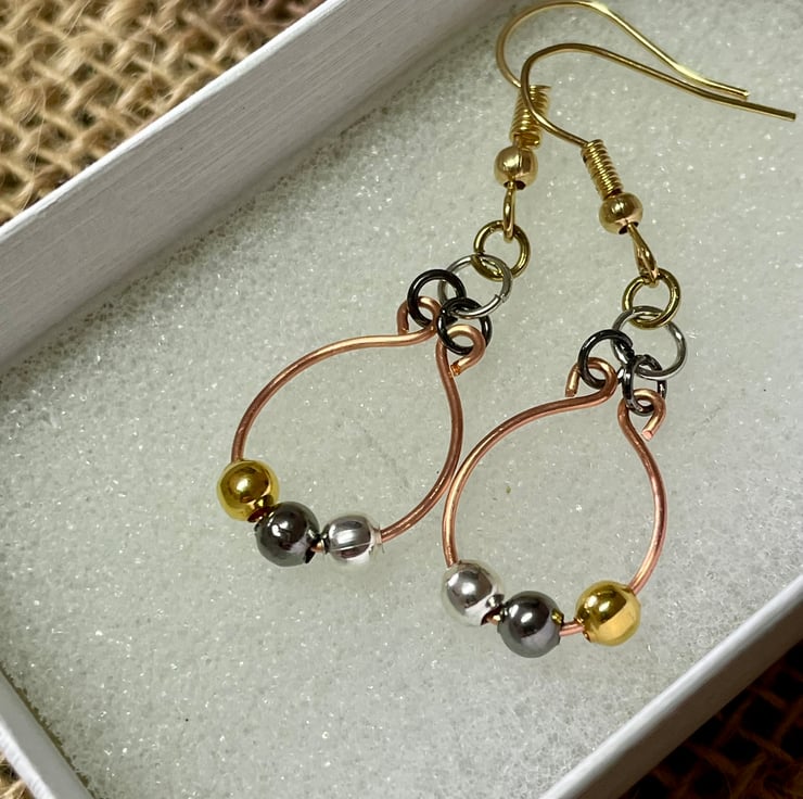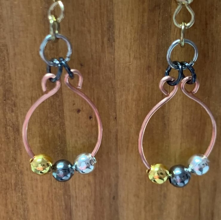 Handmade Copper earrings with three free spinning stainless steel beads in tones of Silver, Gold and Gunmetal Grey. Taking the colours of the beads I have colour matched the other components to match. These pretty One-of-a-kind lightweight earrings are ideal for those who do not like heavy earrings. Ear hooks are Gold Plated.