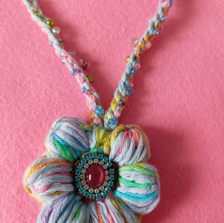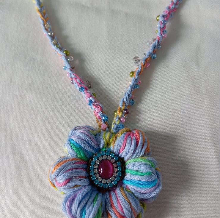 It has a white felt backing so it's soft against the skin and it stops the yarn from catching on buttons etc. I've stitched a mix of seed beads on the cord for extra sparkle and interest.