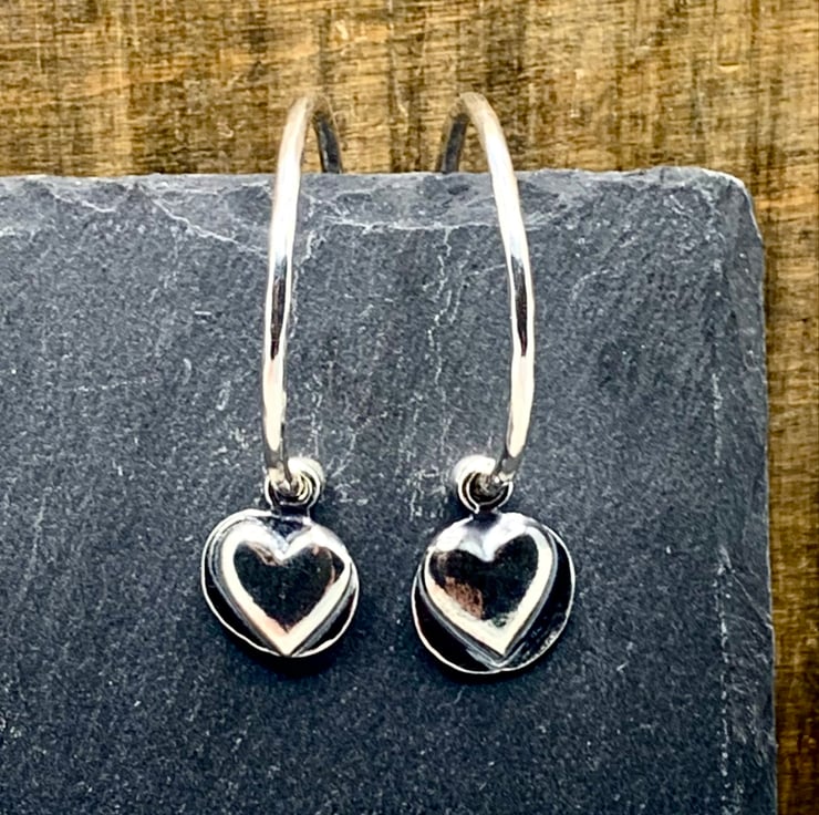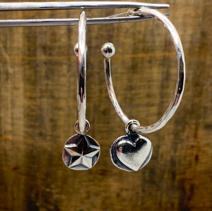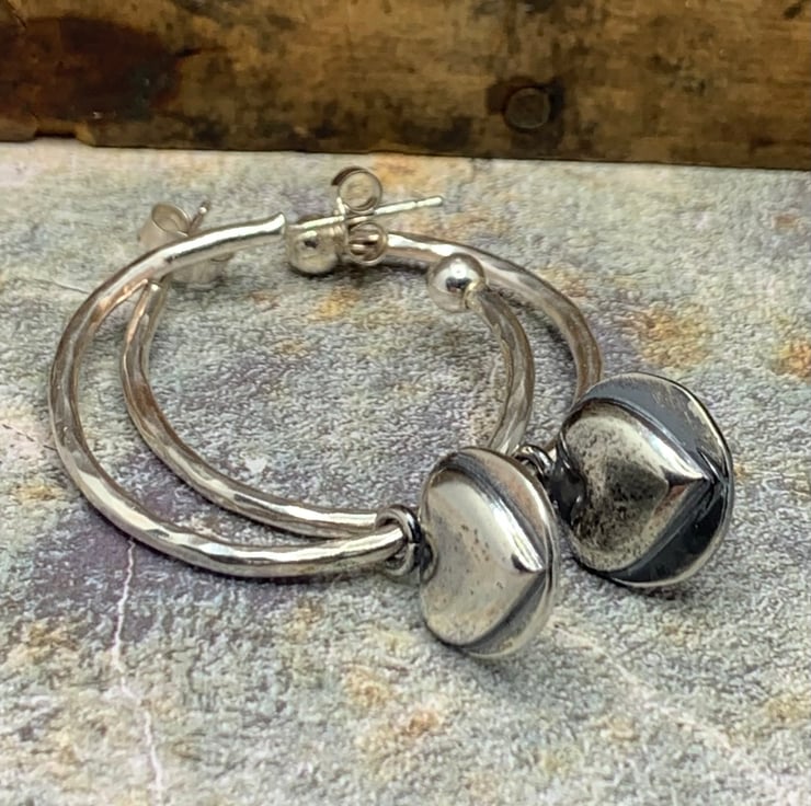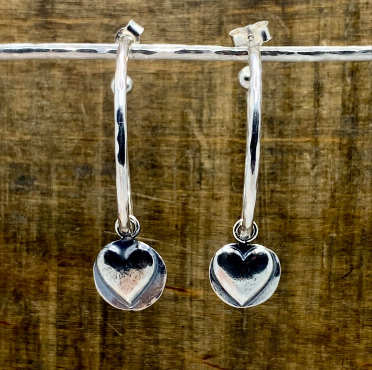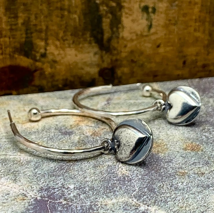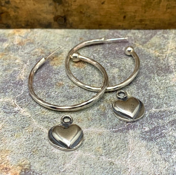 These Sterling Silver Heart Charms hang from 3cm hoops made of Sterling Silver wire. Each pair of handmade earrings features a light dimpled texture that beautifully catches the light.