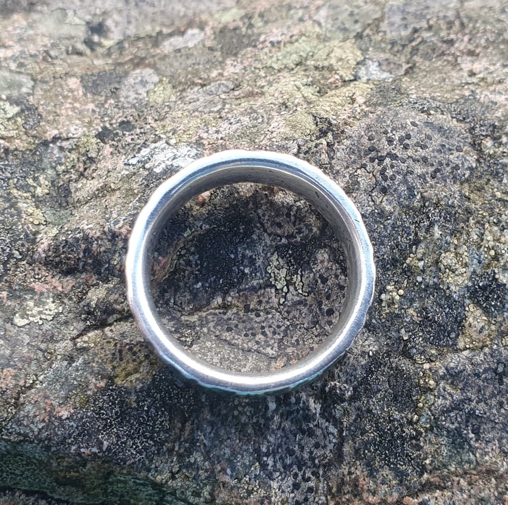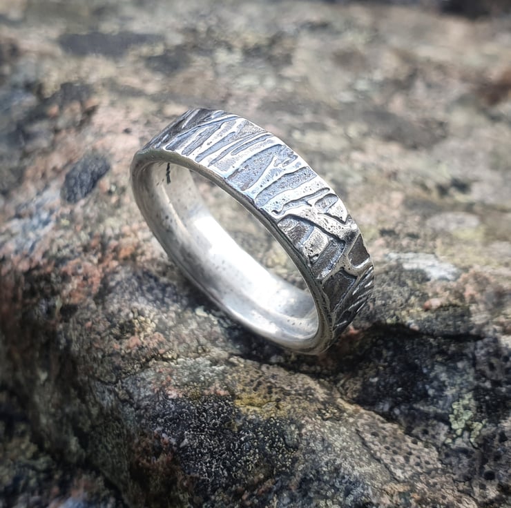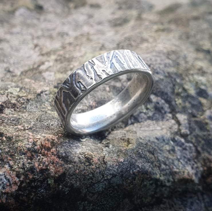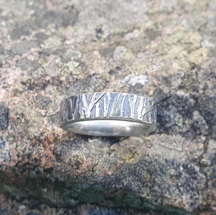 This lovely ring is made from sterling silver, acid etched with a textured finish.