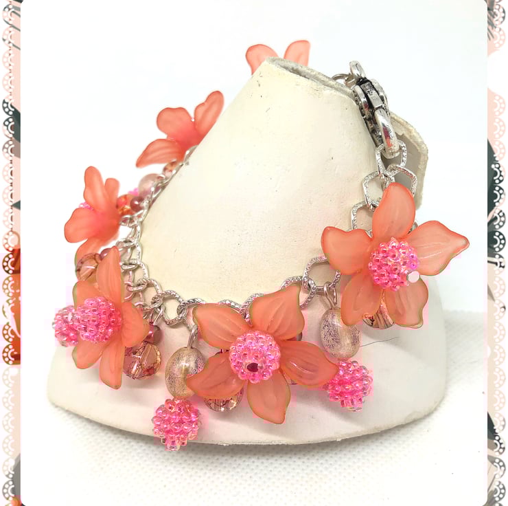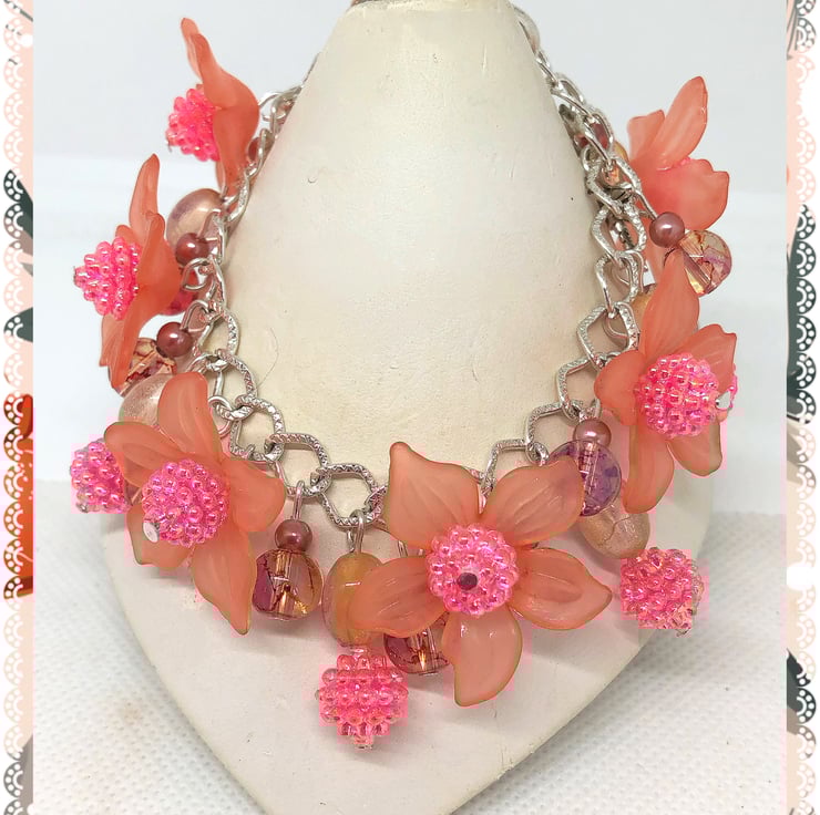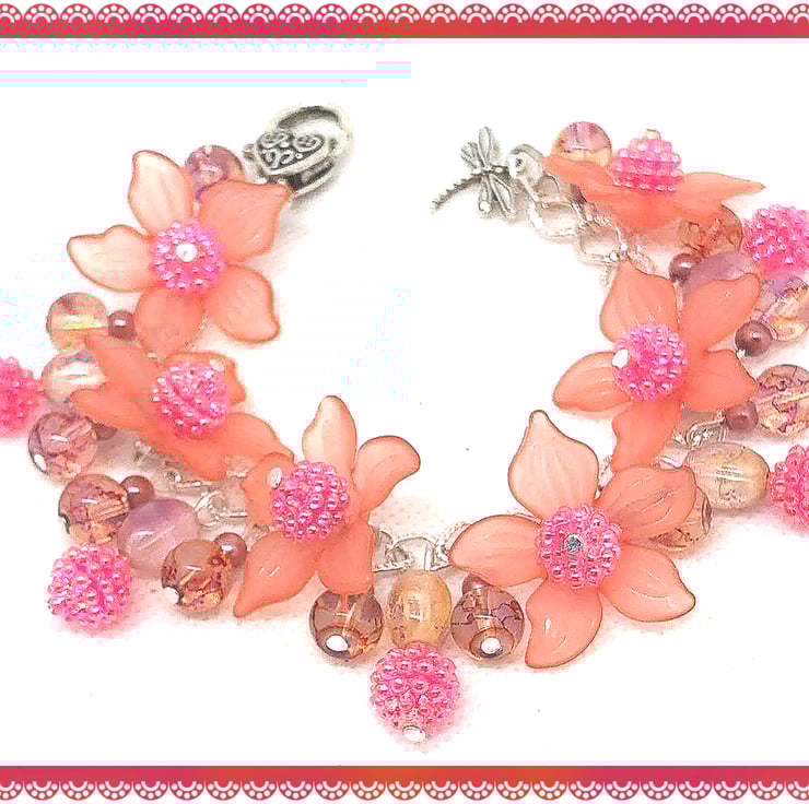 Created using Lucite flowers, acrylic berry beads, Dragon vein glass beads finished with a Tibetan silver dragonfly charm. Nickel free Lobster clasp plus extension chain. Bracelet measures approximately 7 1/2” plus extension chain