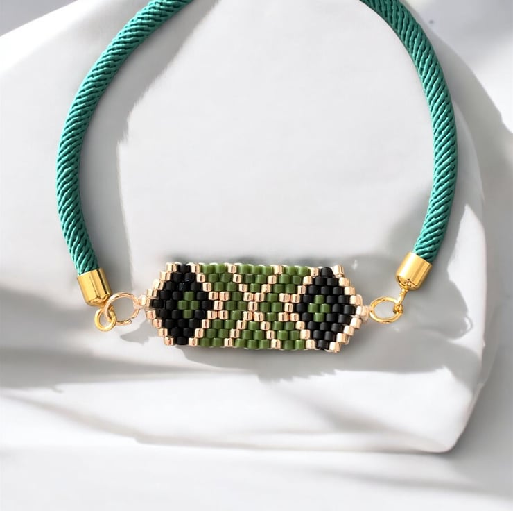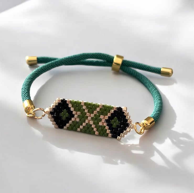 Diamond Design Miyuki Delica Bead Adjustable Bracelet Green Gold & Black,