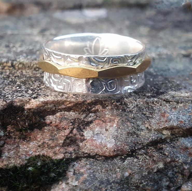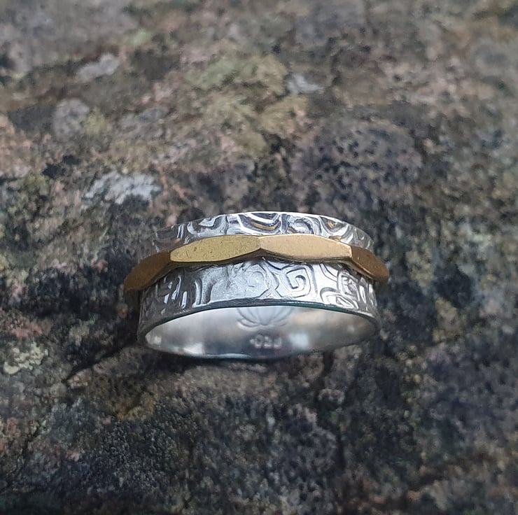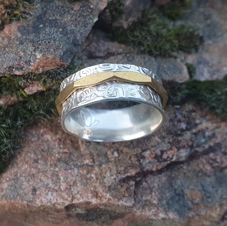 The ring is 8mm wide with a beautiful spiral stamped texture on the band and a faceted look on the brass ring