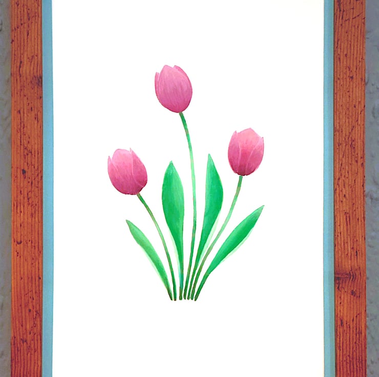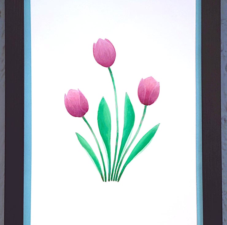 Framed high-quality coloured A3 print of my painting of purple tullips on a white background with a hard backing. The print comes finished with a vibrant light blue border. Framed with an expensive Styrene Protective Perspex (which has same clarity of glass) ready to hang. Choose from three different types of frame; black, oak or dark oak(see images). Colours of print and border may differ slightly due to computer/phone settings. All purchases delivered within 7-10 working days.