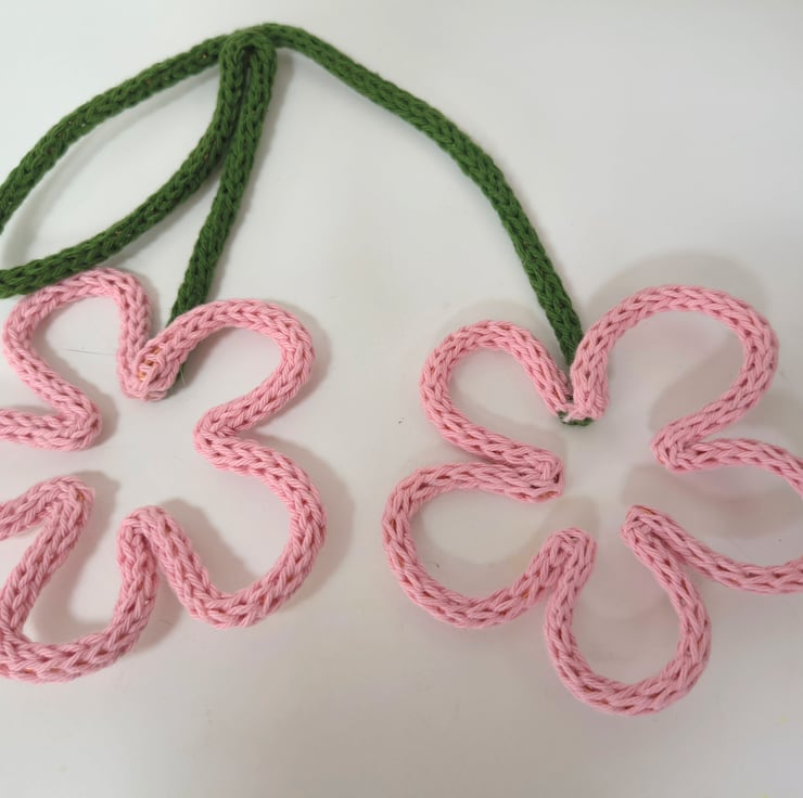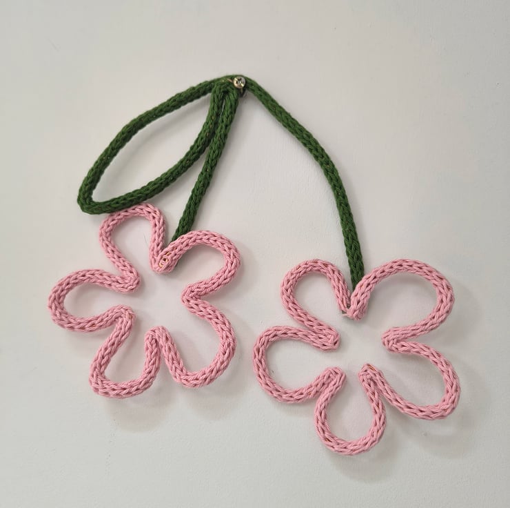 The blossom is made from 100% cotton yarn in a soft , pale pink and the leaves are a zingy bright green.