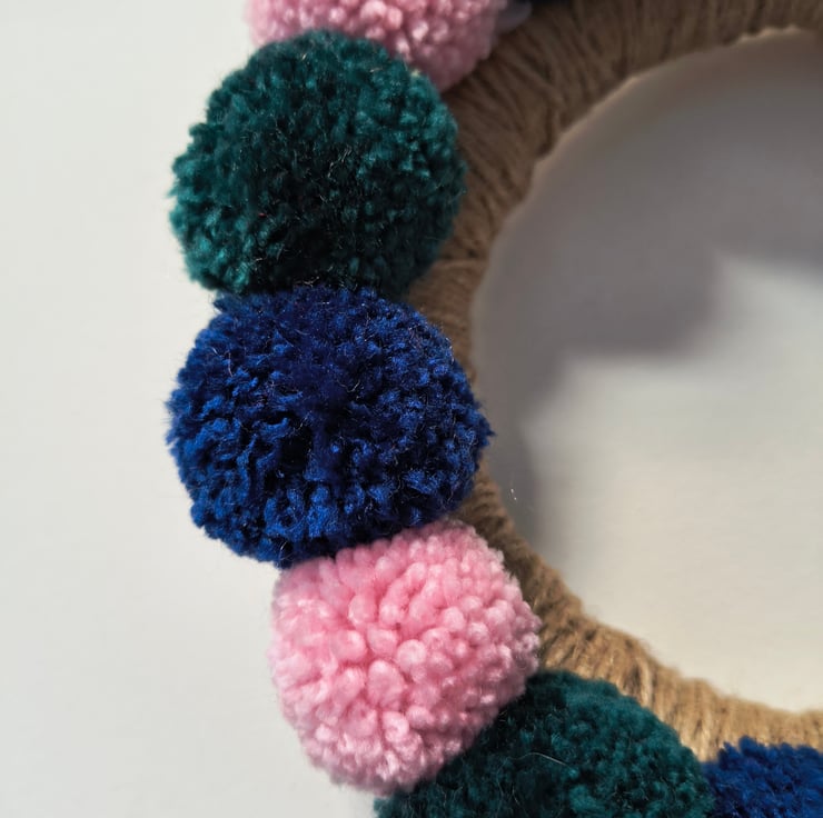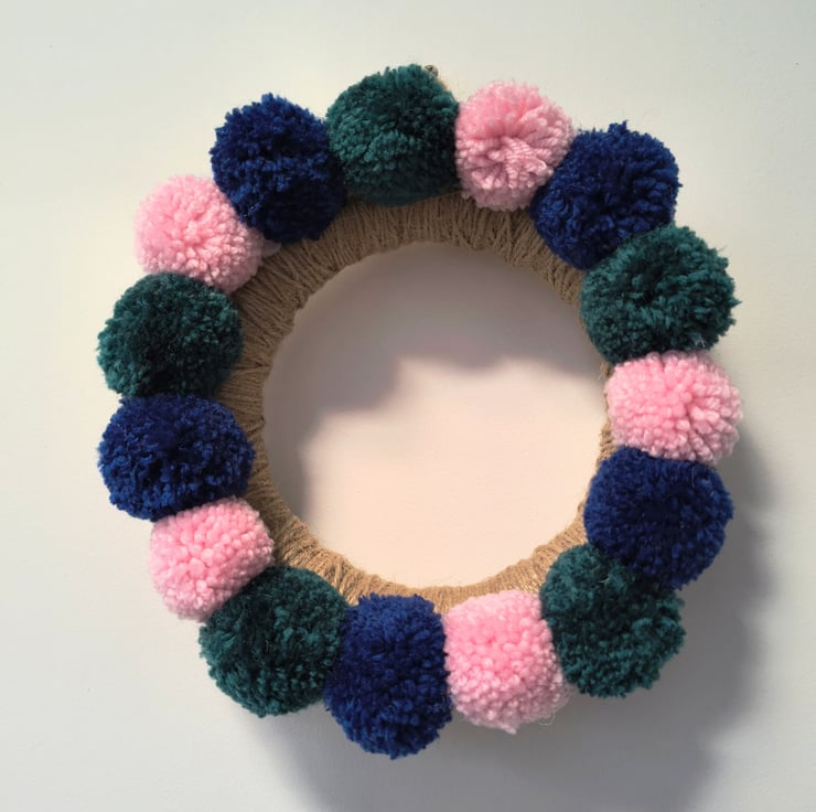 This pompom wreath is a beautiful balance of the strong colours of the navy blue of the night sky, jade green like a forest against the delicate softness of the sunset pink.