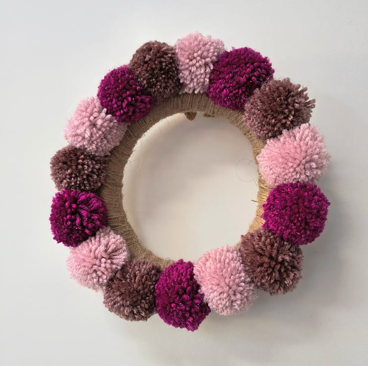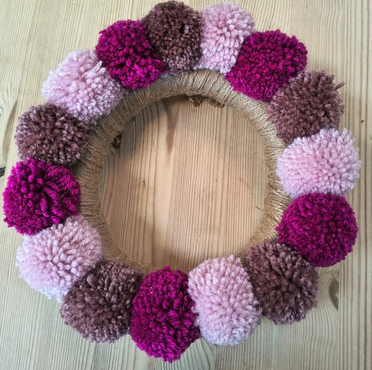 This wreath has delicious fruits of the forest berry coloured pom poms which each have a sparkle in them.